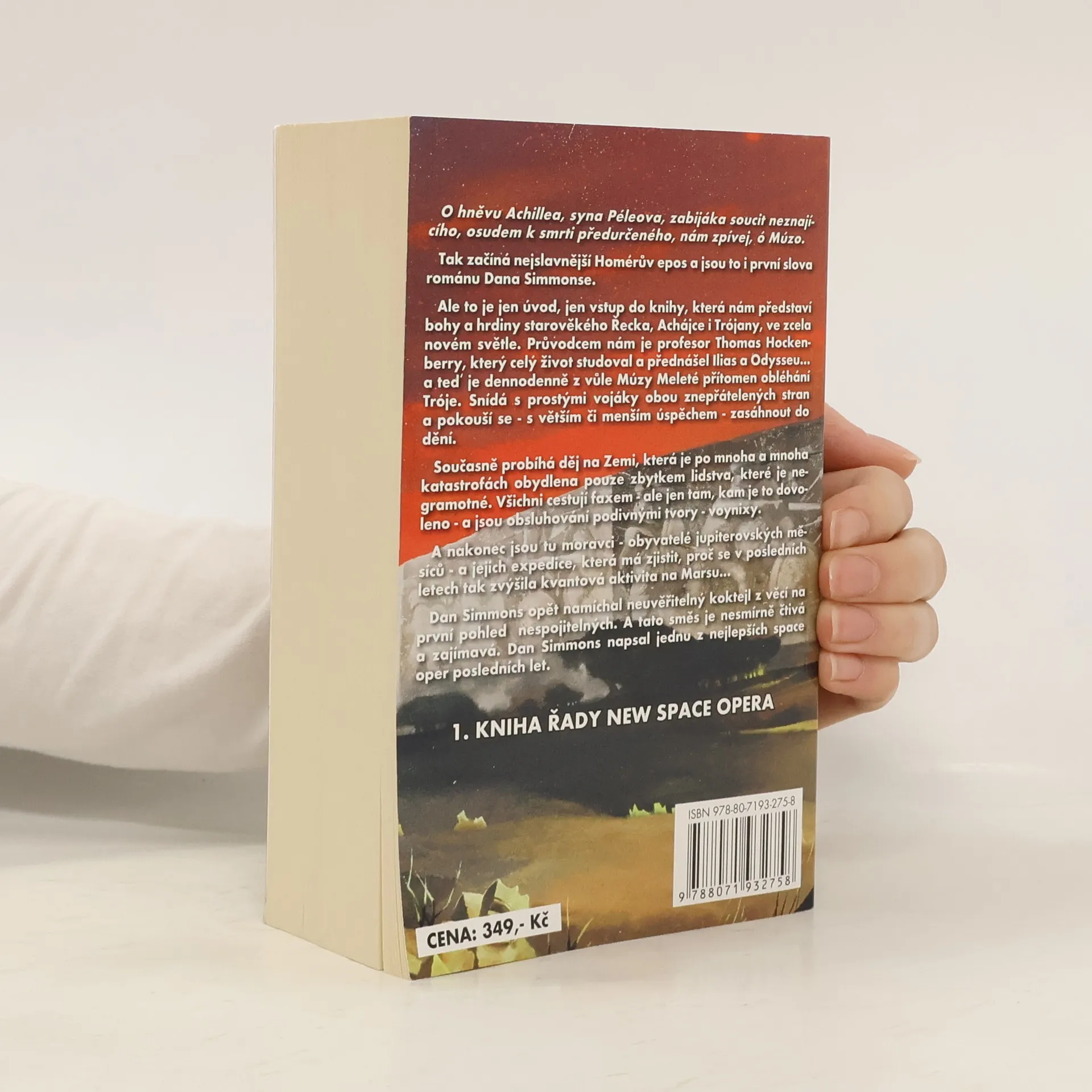 „O hněvu Achillea, syna Péleova, zabijáka soucit neznajícího, osudem k smrti předurčeného, nám zpívej, ó Múzo." Tak začíná nejslavnější Homérův epos a jsou to i první slova románu Dana Simmonse. Ale to je jen úvod, jen vstup do knihy, která nám představí bohy a hrdiny starověkého Řecka, Achájce i Trójany, ve zcela novém světle. Průvodcem nám je profesor Thomas Hockenberry, který celý život studoval a přednášel Ilias a Odysseu… a teď je dennodenně z vůle Múzy Meleté přítomen obléhání Tróje. Snídá s prostými vojáky obou znepřátelených stran a pokouší se – s větším či menším úspěchem – zasáhnout do dění. Současně probíhá děj na Zemi, která je po mnoha a mnoha katastrofách obydlena pouze zbytkem lidstva, které je negramotné. Všichni cestují faxem – ale jen tam, kam je to dovoleno – a jsou obsluhování podivnými tvory – voynixy. A nakonec jsou tu moravci – obyvatelé jupiterovských měsíců – a jejich expedice, která má zjistit, proč se v posledních letech tak zvýšila kvantová aktivita na Marsu… Dan Simmons opět namíchal neuvěřitelný koktejl z věci na první pohled nespojitelných. A tato směs je nesmírně čtivá a zajímavá. Dan Simmons napsal jednu z nejlepších space oper posledních let.... celý text