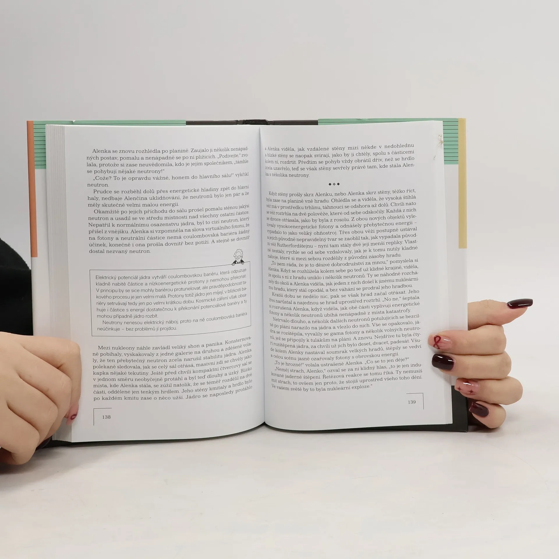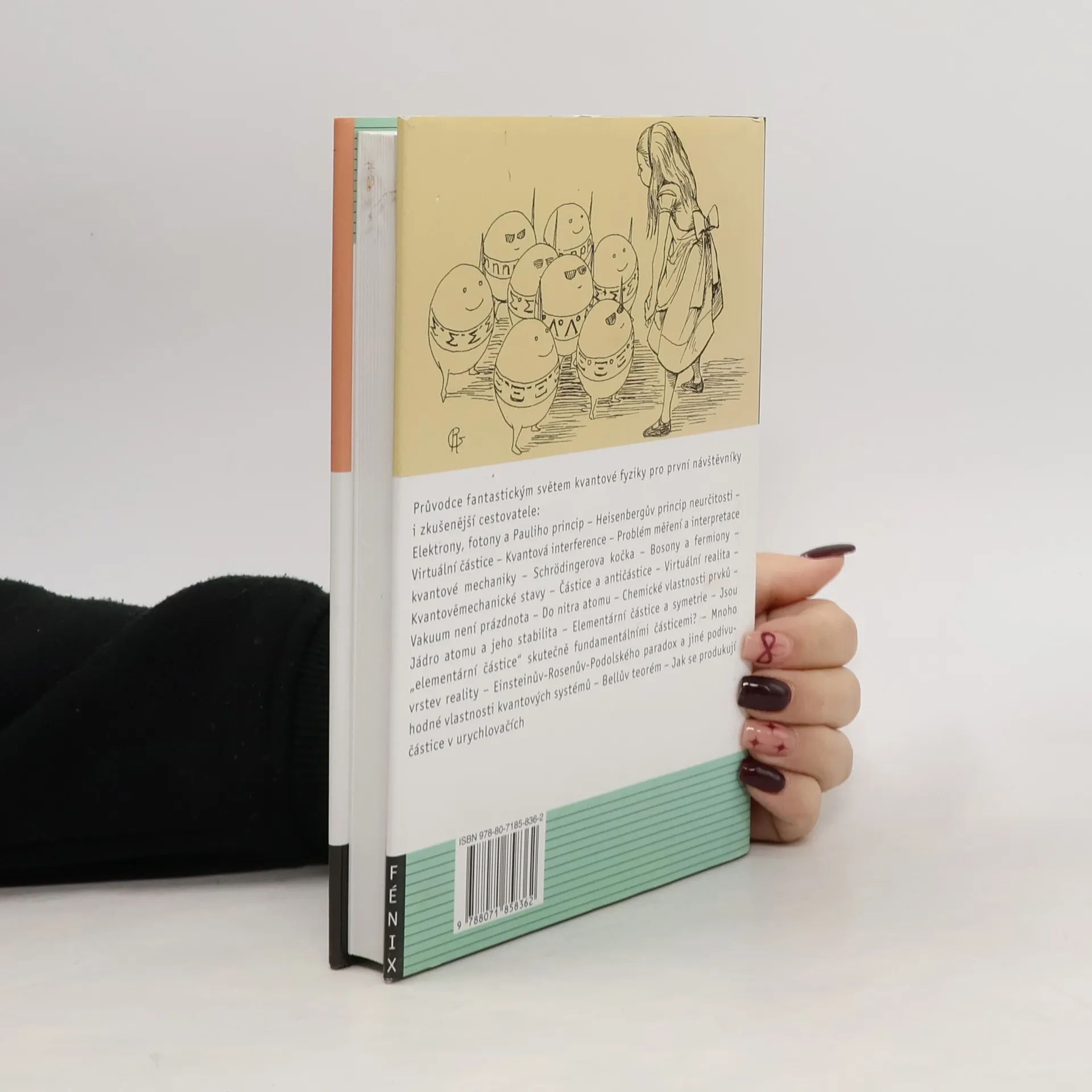 Podtitul: Alegorie kvantové fyziky Originální kniha, jejíž autor ve šlépějích George Gamowa a jeho pana Tompkinse zavádí čtenáře do podivuhodné říše kvant. Průvodcem je mu Alenka, která se do kvantové říše dostává po přečtení Carrollovy Alenky v říši divů, nikoli však králičí norou, ale televizní obrazovkou. Vede čtenáře na taková místa, jako je Heisenbergova banka, Fermiho-Boseho institut či Rutherfordův hrad apod., a seznamuje ho s fundamentálními aspekty kvantové teorie a s mnoha překvapujícími podivnostmi světa kvant, například s Pauliho principem, principem neurčitosti, s obrovským bohatstvím elementárních částic či s různými interpretacemi kvantové mechaniky. Půvabnou a srozumitelně napsanou knihu, která široké čtenářské veřejnosti předkládá nejnovější poznatky vědy, doprovázejí autorovy výstižné ilustrace.