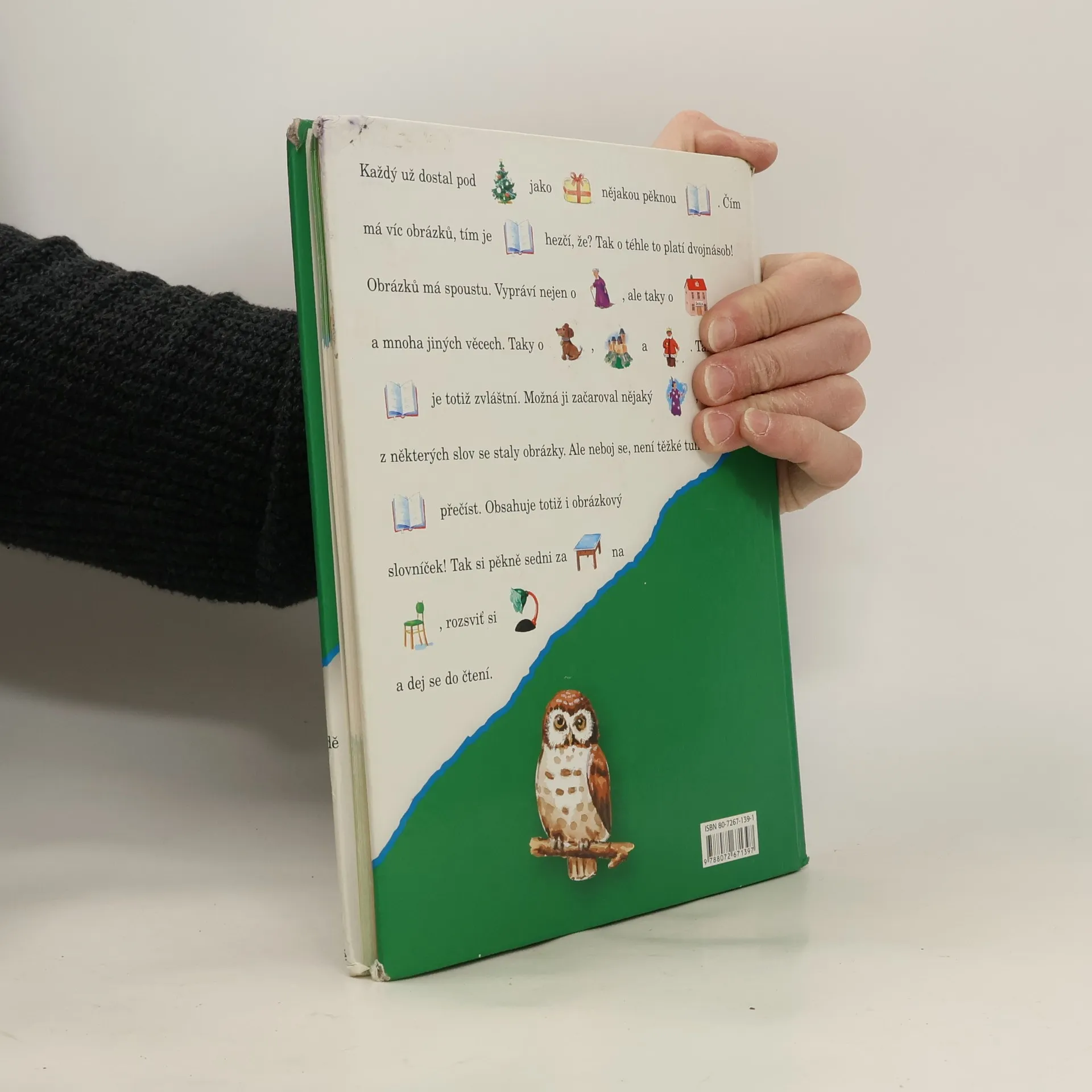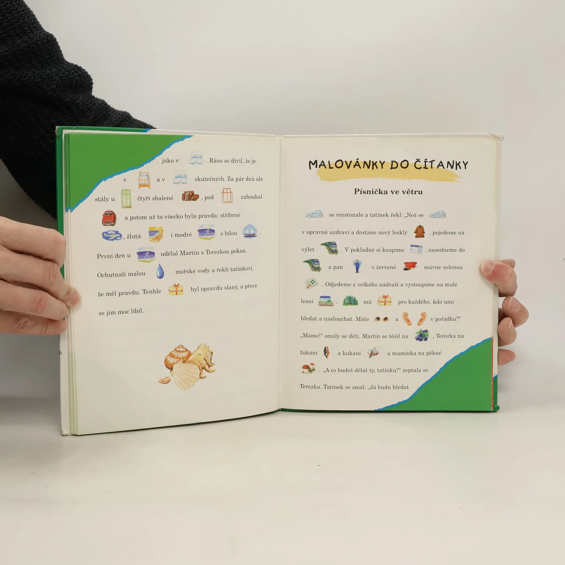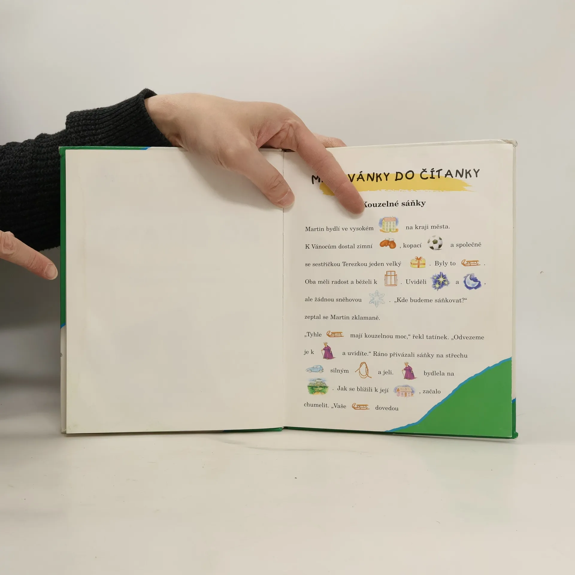 Každý už dostal jako dárek nějakou pěknou knížku. Čím má víc obrázků, tím je knížka hezčí, že? Tak o téhle to platí dvojnásob! Obrázků má spoustu. Vypráví o Martinovi a Terezce, o babičce, ale taky o škole a mnoha jiných věcech. Taky o pejskovi, hradě a králi. Tahle knížka je totiž zvláštní. Možná ji začaroval nějaký kouzelník, protože z některých slov se staly obrázky. Ale nebojte se, není těžké tuhle knížku přečíst. Obsahuje totiž i obrázkový slovníček!