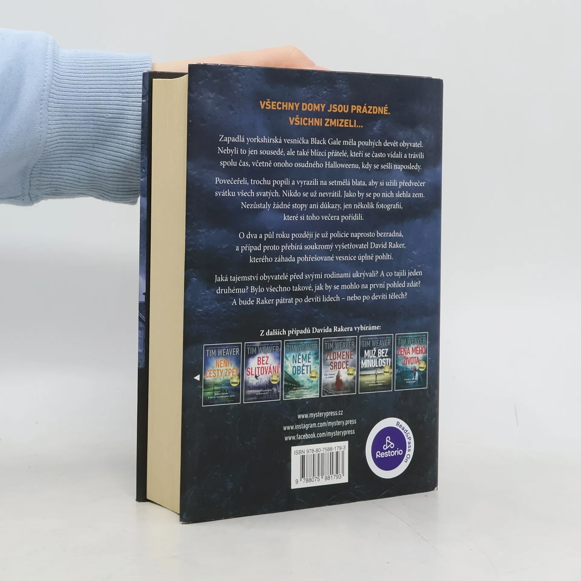 VŠECHNY DOMY JSOU PRÁZDNÉ. VŠICHNI ZMIZELI… Zapadlá yorkshirská vesnička Black Gale měla pouhých devět obyvatel. Nebyli to jen sousedé, ale také blízcí přátelé, kteří se často vídali a trávili spolu čas, včetně onoho osudného Halloweenu, kdy se sešli naposledy. Povečeřeli, trochu popili a vyrazili na setmělá blata, aby si užili předvečer svátku všech svatých. Nikdo se už nevrátil. Jako by se po nich slehla zem. Nezůstaly žádné stopy ani důkazy, jen několik fotografií, které si toho večera pořídili. O dva a půl roku později je už policie naprosto bezradná, a případ proto přebírá soukromý vyšetřovatel David Raker, kterého záhada pohřešované vesnice úplně pohltí. Jaká tajemství obyvatelé před svými rodinami ukrývali? A co tajili jeden druhému? Bylo všechno takové, jak by se mohlo na první pohled zdát? A bude Raker pátrat po devíti lidech – nebo po devíti tělech?