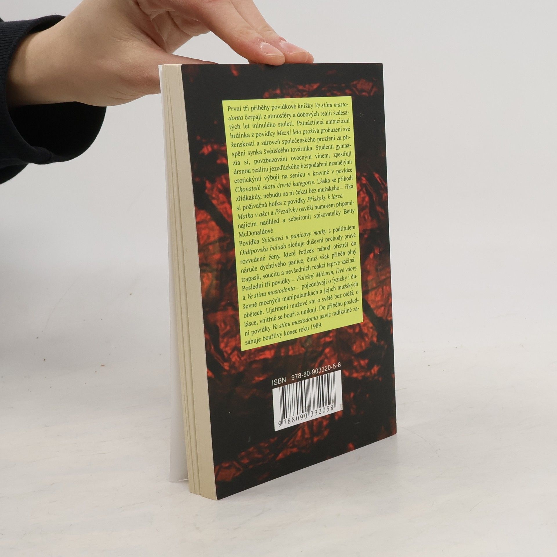 Kniha povídek autorky bestselleru "Bereme, co je". První tři příběhy povídkové knížky Ve stínu mastodonta čerpají z atmosféry a dobových reálií šedesátých let minulého století. Patnáctiletá ambiciózní hrdinka z povídky Mezní léto prožívá probuzení své ženskosti a zároveň společenského prozření za přispění synka švédského továrníka. Studenti gymnázia si, povzbuzováni ovocným vínem, zpestřují drsnou realitu jezeďáckého hospodaření nesmělými erotickými výboji na seníku v kravíně v povídce Chovatelé skotu čtvrté kategorie. Láska se přihodí zřídkakdy, nebudu na ni čekat bez mužského — říká si poživačná holka z povídky Přískoky k lásce. Matka v akci a Přezdívky osvěží humorem připomínajícím nadhled a sebeironii spisovatelky Betty McDonaldové. Povídka Svíčková u panicovy matky s podtitulem Oidipovská balada sleduje duševní pochody právě rozvedené ženy, které řetízek náhod přistrčí do náruče dychtivého panice, čímž však příběh plný trapasů, soucitu a nevšedních reakcí teprve začíná. Poslední tři povídky — Falešný Mičurin, Dvě vdovy a Ve stínu mastodonta — pojednávají o fyzicky i duševně mocných manipulantkách a jejich mužských obětech. Ujařmení mužové sní o světě bez otěží, o lásce, vnitřně se bouří a unikají. Do příběhu poslední povídky Ve stínu mastodonta navíc radikálně zasahuje bouřlivý konec roku 1989.