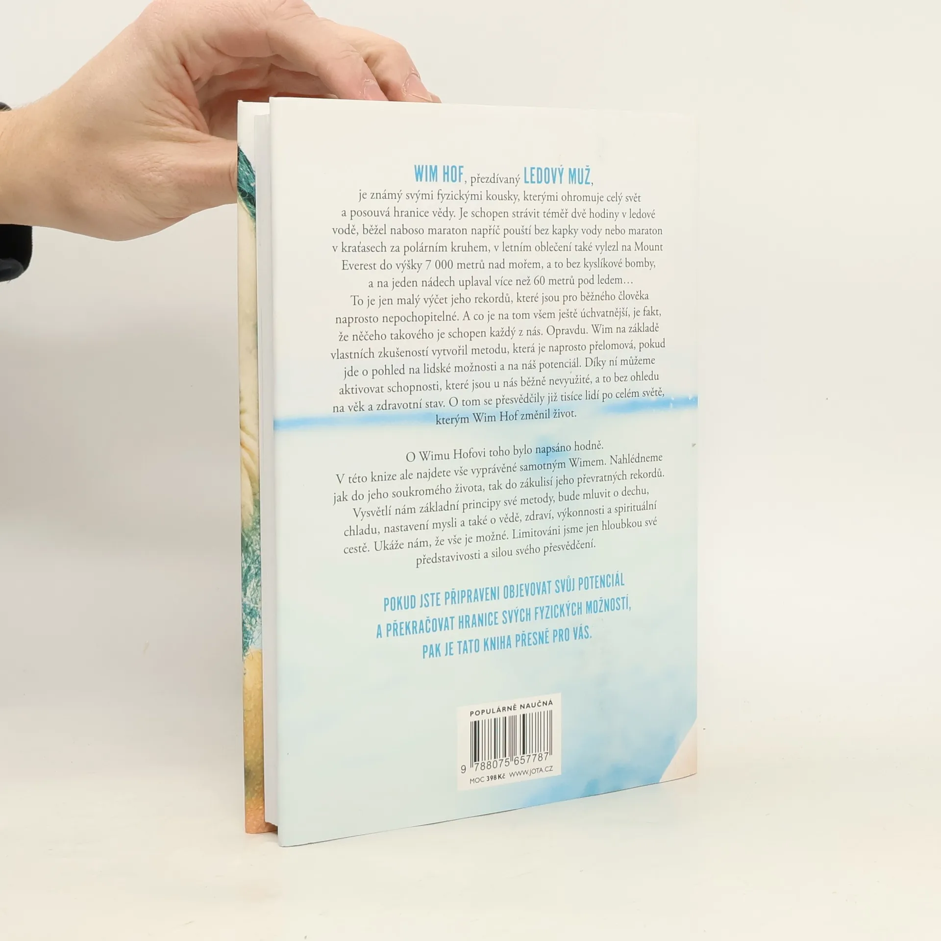 Jediná autorizovaná kniha Wima Hofa představuje převratnou metodu, která nám umožňuje využít náš fyzický i duševní potenciál. Wim Hof, známý jako Ledový muž, ohromuje svět svými neuvěřitelnými výkony, jako je strávení téměř dvou hodin v ledové vodě, běhání maratonů bez vody a výstupy na Mount Everest bez kyslíku. Tyto rekordy mohou vypadat nepochopitelně, ale Hof tvrdí, že podobných schopností může dosáhnout každý z nás. Na základě svých zkušeností vytvořil metodu, která mění pohled na lidské možnosti a aktivuje nevyužité schopnosti, bez ohledu na věk či zdravotní stav. Tisíce lidí po celém světě již pocítily pozitivní změny ve svém životě díky této metodě. Kniha nabízí osobní pohled na Hofův život a zákulisí jeho rekordů. Vysvětluje základní principy jeho metody, včetně technik dýchání, práce s chladem, nastavení mysli a souvislostí se zdravím a spirituálním rozvojem. Hof ukazuje, že naše limity jsou určeny pouze hloubkou naší představivosti a silou přesvědčení. Pokud jste připraveni objevovat svůj potenciál a překonávat fyzické hranice, tato kniha je pro vás. „Tato metoda je jednoduchá, přístupná a vědecky podložená. Může ji praktikovat kdokoli, bez dogmat, pouze s přijetím a svobodou.“