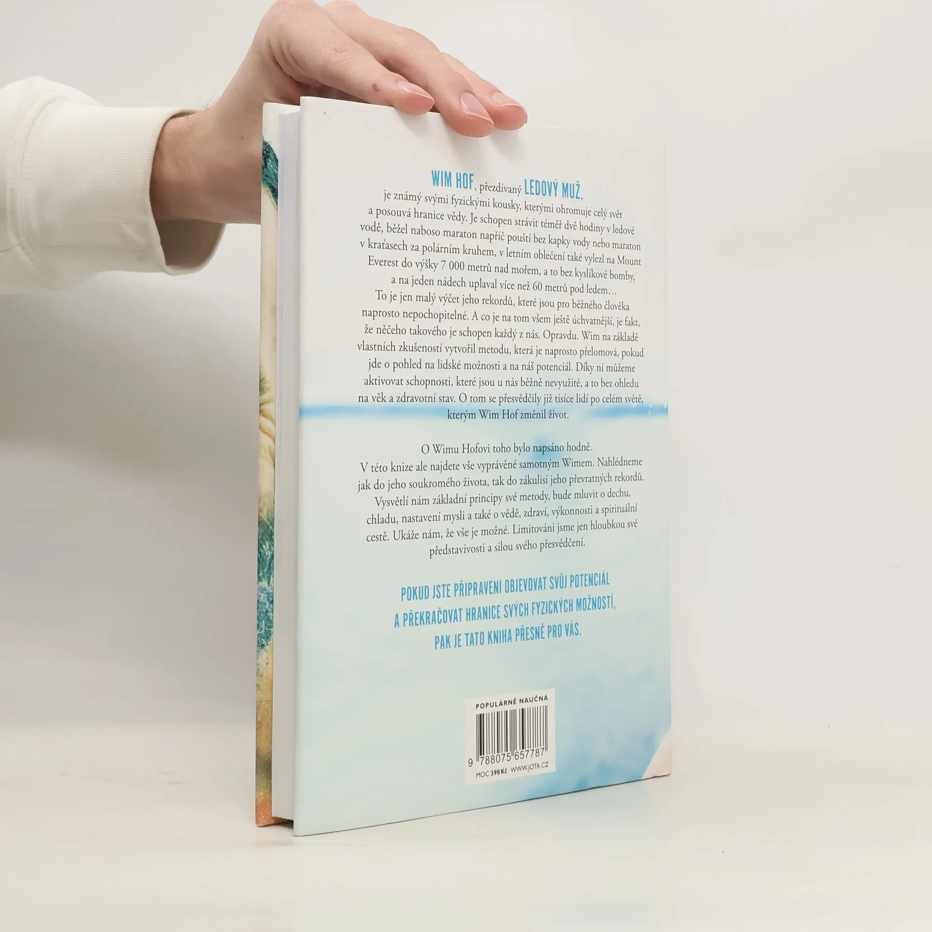 Jediná autorizovaná kniha Wima Hofa představuje převratnou metodu, která nám umožňuje využít náš fyzický i duševní potenciál. Wim Hof, známý jako Ledový muž, ohromuje svět svými neuvěřitelnými výkony, jako je strávení téměř dvou hodin v ledové vodě, běhání maratonů bez vody a výstupy na Mount Everest bez kyslíku. Tyto rekordy mohou vypadat nepochopitelně, ale Hof tvrdí, že podobných schopností může dosáhnout každý z nás. Na základě svých zkušeností vytvořil metodu, která mění pohled na lidské možnosti a aktivuje nevyužité schopnosti, bez ohledu na věk či zdravotní stav. Tisíce lidí po celém světě již pocítily pozitivní změny ve svém životě díky této metodě. Kniha nabízí osobní pohled na Hofův život a zákulisí jeho rekordů. Vysvětluje základní principy jeho metody, včetně technik dýchání, práce s chladem, nastavení mysli a souvislostí se zdravím a spirituálním rozvojem. Hof ukazuje, že naše limity jsou určeny pouze hloubkou naší představivosti a silou přesvědčení. Pokud jste připraveni objevovat svůj potenciál a překonávat fyzické hranice, tato kniha je pro vás. „Tato metoda je jednoduchá, přístupná a vědecky podložená. Může ji praktikovat kdokoli, bez dogmat, pouze s přijetím a svobodou.“