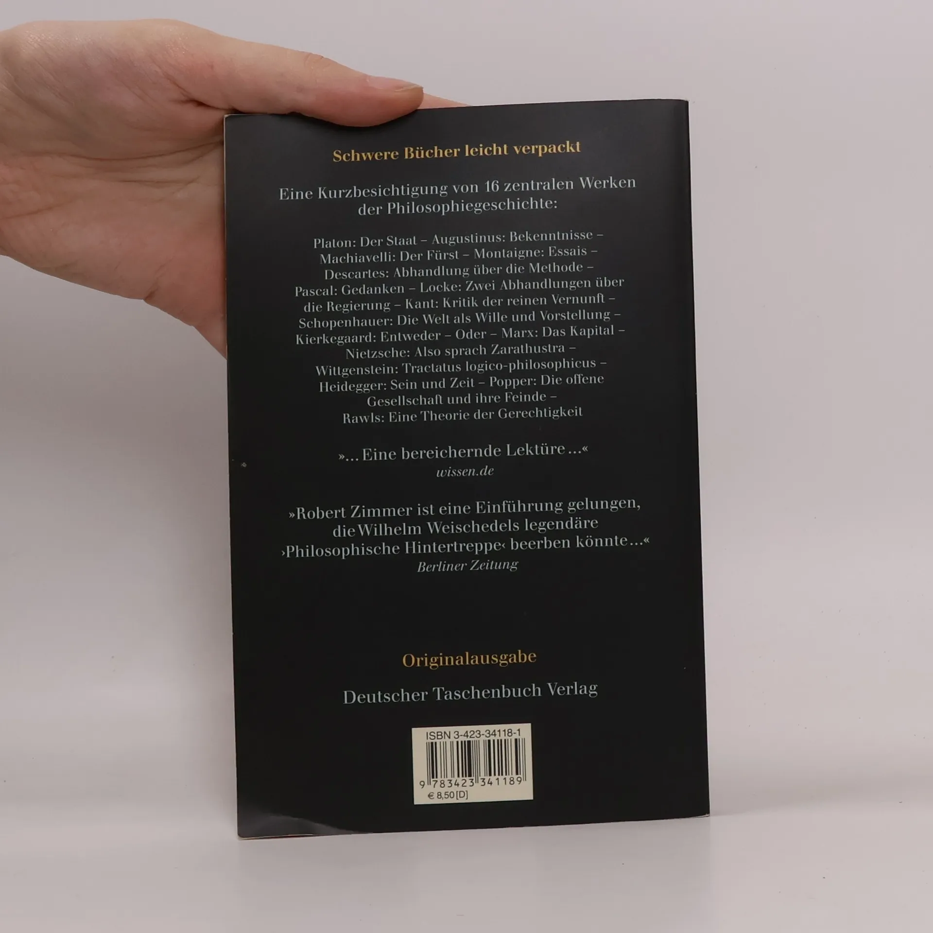 Gedanken beim Eintritt ins Philosophenportal Sie haben Geschichte gemacht und sind in den Regalen der Welt beheimatet – meist jedoch ungelesen: die Klassiker der Philosophie wie etwa Kants ›Kritik der Urteilskraft‹ oder Nietzsches ›Also sprach Zarathustra‹. Der studierte Philosoph Robert Zimmer hat sich der schwergewichtigen Bücher angenommen und sie bekömmlich aufbereitet. In einer Art Kurzbesichtigung führt er den Leser in die Räume von 16 zentralen Werken der Philosophiegeschichte, angefangen bei Platons ›Staat‹ bis hin zu John Rawls’ ›Theorie der Gerechtigkeit‹. Dabei stellt er die Kerngedanken einer jeden Schrift vor, beschreibt ihren Entstehungsrahmen und macht die Verknüpfung mit Leben und Denken des Autors deutlich. Eine ebenso unterhaltsame wie informative philosophische Bildungsreise! Aus dem Inhalt: – Platon: Der Staat– Augustinus: Bekenntnisse– Machiavelli: Der Fürst– Montaigne: Essais– Descartes: Abhandlung über die Methode– Blaise Pascal: Gedanken– John Locke: Zwei Abhandlungen über die Regierung– Kant: Kritik der reinen Vernunft– Schopenhauer: Die Welt als Wille und Vorstellung– Kierkegaard: Entweder – Oder– Karl Marx: Das Kapital– Nietzsche: Also sprach Zarathustra– Wittgenstein: Tractatus logico-philosophicus– Heidegger: Sein und Zeit– Popper: Die offene Gesellschaft und ihre Feinde– Rawls: Theorie der Gerechtigkeit