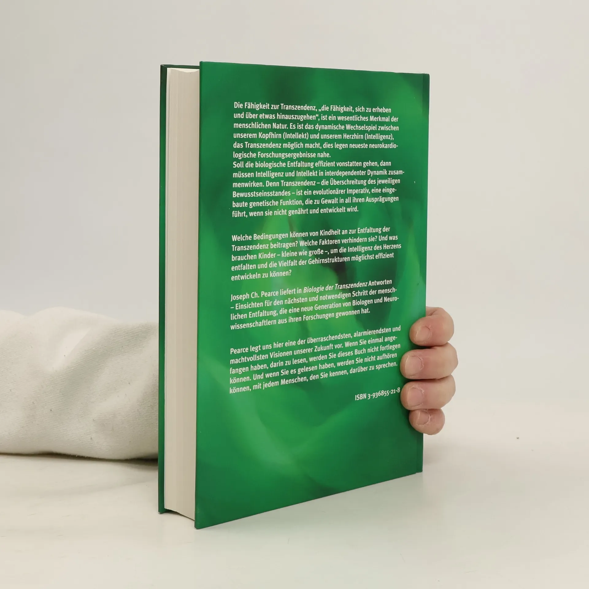 „Biologie der Transzendenz“ erinnert uns daran, dass wir nicht zu einem endlosen Kreislauf von Hass und Verwüstung verdammt sind. „Pearce legt uns hier eine der überraschendsten, alarmierendsten und machtvollsten Visionen unserer Zukunft vor. Wenn Sie einmal angefangen haben darin zu lesen, werden Sie dieses Buch nicht fortlegen können. Und wenn Sie es gelesen haben, werden Sie nicht aufhören können, mit jedem Menschen den Sie kennen darüber zu sprechen.“ Thom Hartmann, Autor von „Unser ausgebrannter Planet“ Neueste Forschungsergebnisse lokalisieren im menschlichen Körper fünf neuronale Zentren – oder „Hirne“. Unser viertes und gegenwärtig weitest entwickelte Hirn findet sich im Kopf, das fünfte im Herzen. Es ist das dynamische Wechselspiel zwischen unserem Kopfhirn (Intellekt) und dem Herzhirn (Intelligenz), das die Überwindung unserer heutigen evolutionären Stufe möglich macht. Diese Überschreitung des jeweiligen Bewusstseinsstandes, auch „Transzendenz“ genannt, ist ein evolutionärer Imperativ, eine eingebaute genetische Funktion, die zu Gewalt in all ihren Ausprägungen führt, wenn sie nicht genährt und entwickelt wird.