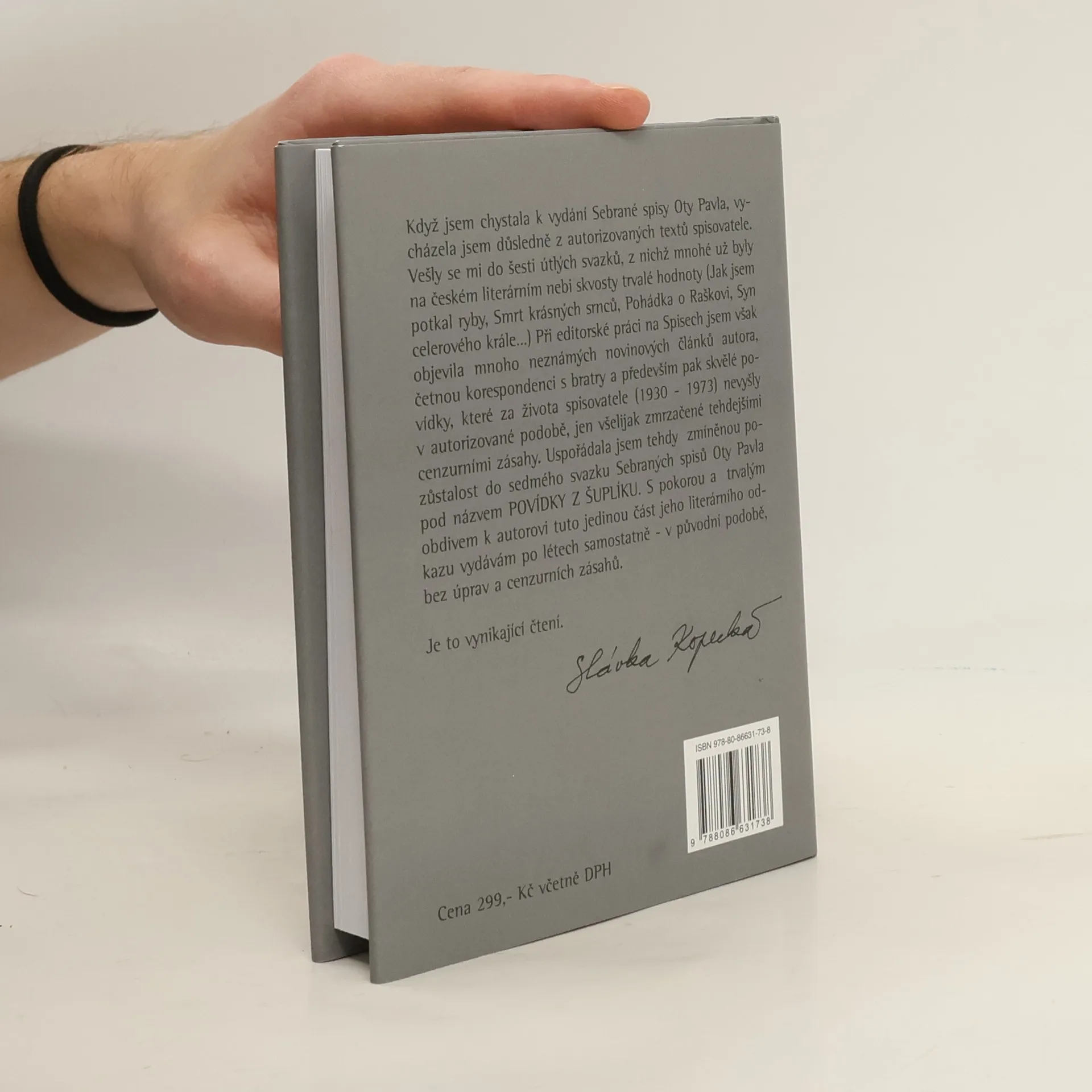 V závěrečném svazku Sebraných spisů Oty Pavla najdeme texty, které za života autora vyšly většinou jen časopisecky, knižně jako příležitostné články, úvody či sborníky. V sedmdesátých letech kolovaly některé povídky v opisech, protože naděje na knižní vydání neměly. Dále jsou do publikace zařazeny texty z pozůstalosti, které v sedmdesátých letech kolovaly pouze v opisech a později byly zařazovány do různých povídkových výborů. Knížku, rozdělenou tematicky do pěti částí, uvozuje fragment emotivní rodinné korespondence. Svazek tak z jiného pohledu doplňuje dosud vydané dílo.
