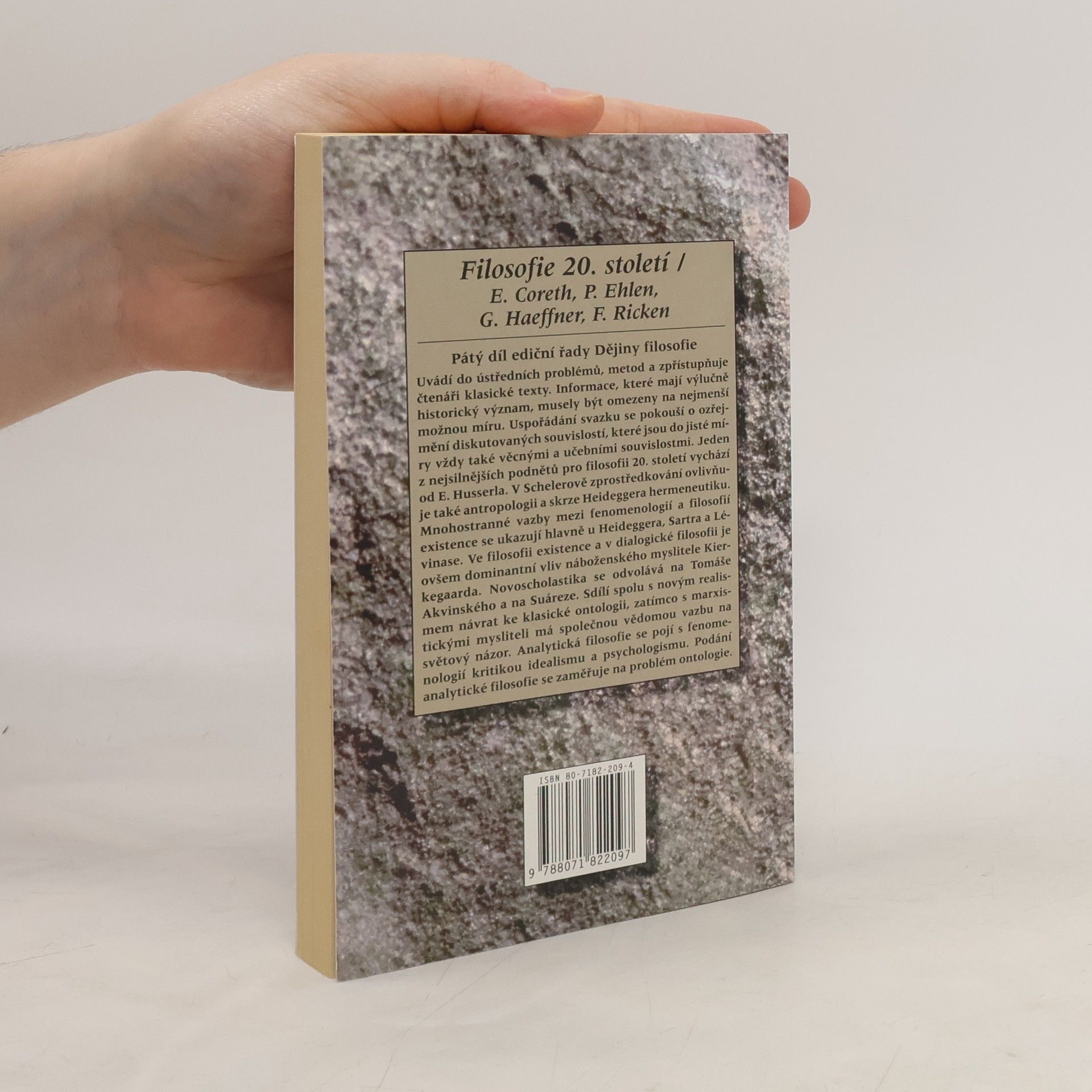 Pátý díl ediční řady Dějiny filosofie Uvádí do ústředních problémů, metod a zpřístupňuje čtenáři klasické texty. Informace, které mají výlučně historický význam, musely být omezeny na nejmenší možnou míru. Uspořádání svazku se pokouší o ozřejmění diskutovaných souvislostí, které jsou do jisté míry vždy také věcnými a učebními souvislostmi. Jeden z nejsilnějších podnětů pro filosofii 20. století vychází od E. Husserla. V Schelerově zprostředkování ovlivňuje také antropologii a skrze Heideggera hermeneutiku. Mnohostranné vazby mezi fenomenologií a filosofií existence se ukazují hlavně u Heideggera, Sartra a Lévinase. Ve filosofii existence a v dialogické filosofii je ovšem dominantní vliv náboženského myslitele Kierkegaarda. Novoscholastika se odvolává na Tomáše Akvinského a na Suáreze. Sdílí spolu s novým realismem návrat ke klasické ontologii, zatímco s marxistickými mysliteli má společnou vědomou vazbu na světový názor. Analytická filosofie se pojí s fenomenologií kritikou idealismu a psychologismu. Podání analytické filosofie se zaměřuje na problém ontologie.