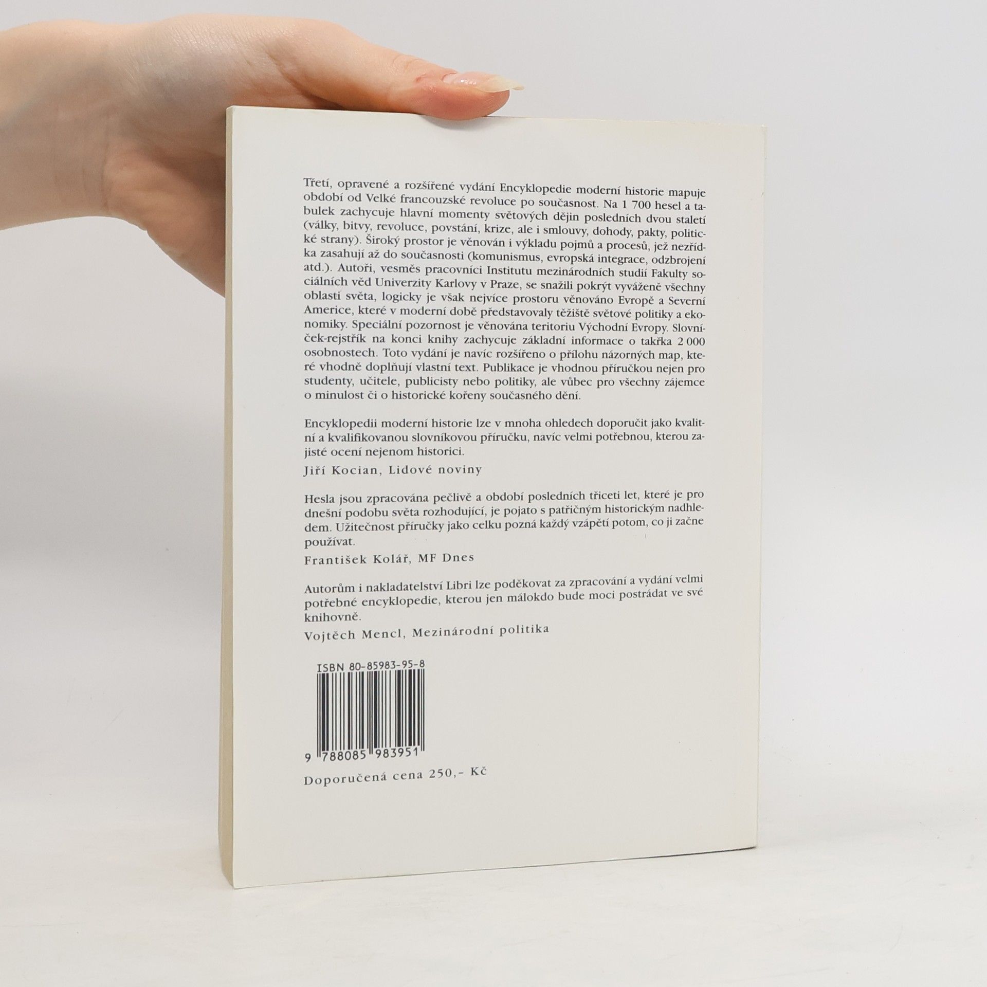 Další vydání encyklopedie, která byla po řadě desetiletí prvním slovníkem moderních a nejnovějších dějin z pera českých autorů. Slovník mapuje období od Velké francouzské revoluce (1789) po současnost. Téměř 2 000 hesel a tabulek zachycuje hlavní momenty světových dějin posledních dvou staletí: války, bitvy, revoluce, krize, povstání, ale i smlouvy, pakty, míry, dohody, politické strany a další pojmy. 3. rozšířené vydání.