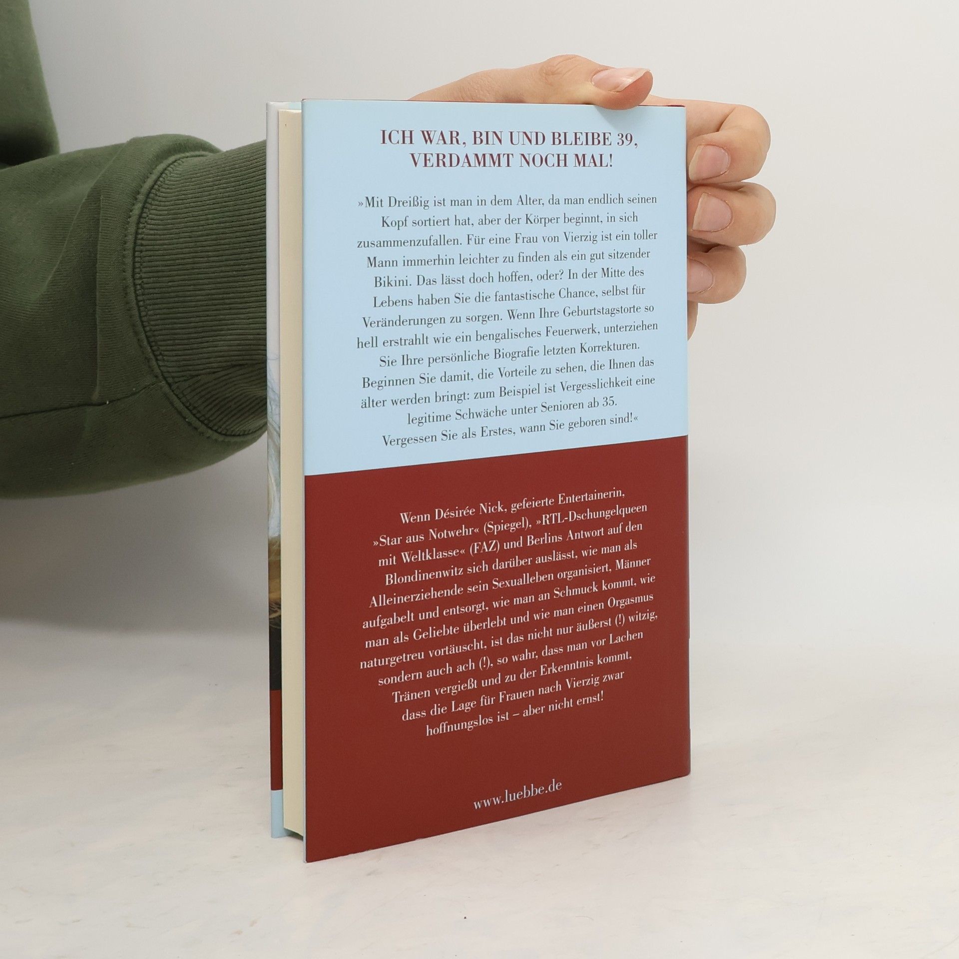 Ich war, bin und bleibe 39, verdammt noch mal! „Mit Dreißig ist man in dem Alter, da man endlich seinen Kopf sortiert hat, aber der Körper beginnt, in sich zusammenzufallen. Für eine Frau von Vierzig ist ein toller Mann immerhin leichter zu finden, als ein gut sitzender Bikini. Das lässt doch hoffen, oder? In der Mitte des Lebens haben Sie die fantastische Chance, selbst für Veränderungen zu sorgen. Wenn Ihre Geburtstagstorte so hell erstrahlt, wie ein bengalisches Feuerwerk, unterziehen Sie Ihre persönliche Biografie letzten Korrekturen. Beginnen Sie damit, die Vorteile zu sehen, die Ihnen das älter werden bringt: zum Bespiel ist Vergesslichkeit eine legitime Schwäche unter Senioren ab 35. Vergessen Sie als Erstes, wann Sie geboren sind!“