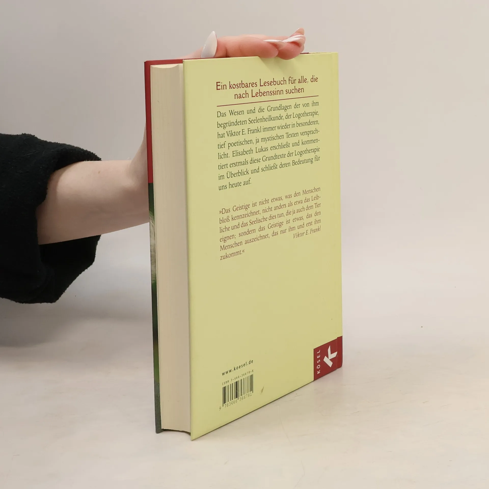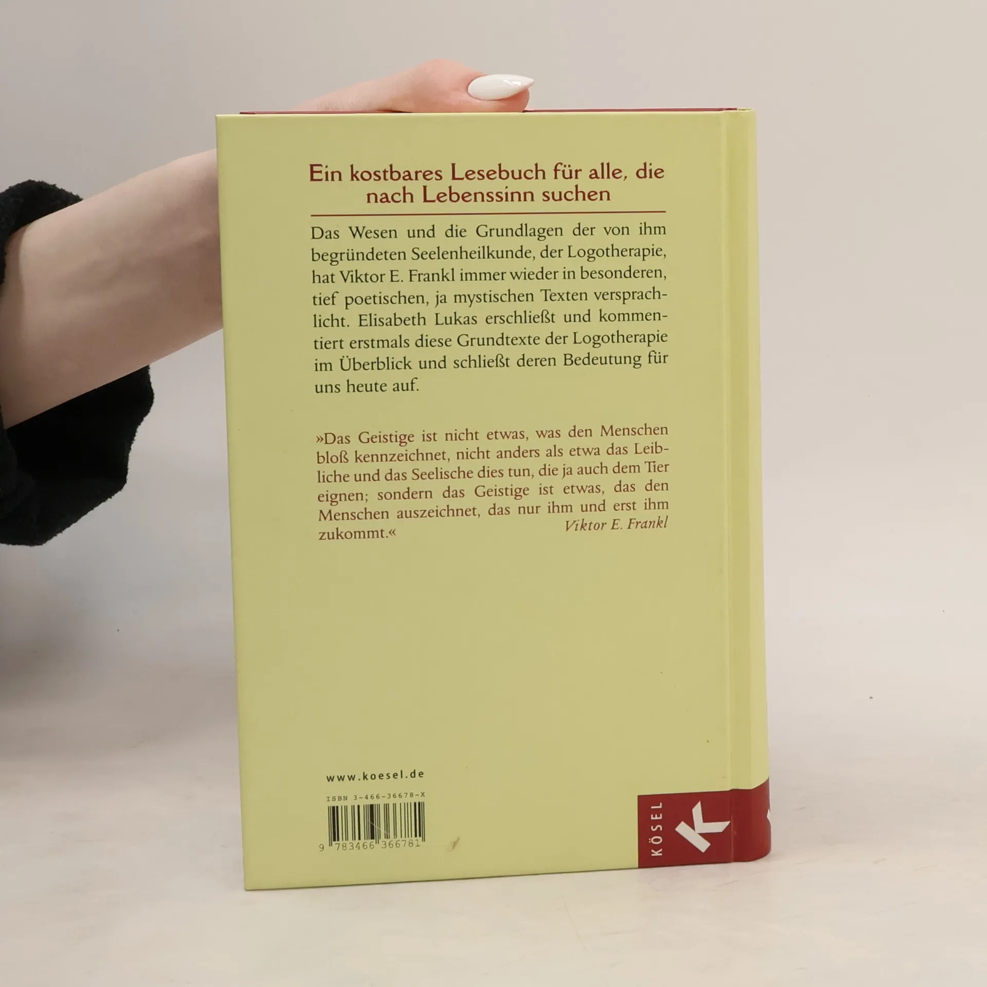 Die schönsten Texte Viktor E. Frankls Die Logotherapie befähigt Menschen in belastenden Situationen und mit schwer lösbaren Problemen, Sinn im Leben neu zu entdecken. Diese positive und humane Psychotherapie geht zurück auf Viktor E. Frankl (1905–1997). Der große Arzt, Therapeut, Schriftsteller und international renommierte Lehrer würde am 26. März 2005 einhundert Jahre alt werden. Aus diesem Anlass hat Elisabeth Lukas, seine bedeutendste Schülerin, die schönsten, tief poetischen, ja mystischen Texte aus Viktor E. Frankls Gesamtwerk zusammengestellt. Das Wesen und die Grundlagen der Logotherapie hat Frankl immer wieder in Gleichnissen verdichtet. Erstmals sind diese Grundtexte der Logotherapie im Überblick greifbar. Elisabeth Lukas kommentiert die Gleichnisse Frankls und schließt deren Bedeutung für heute auf. Ein kostbares Lesebuch für alle, die nach Lebenssinn suchen. Hilfreich für alle, die die Seelenheilkunde nach Viktor E. Frankl schätzen oder kennen lernen wollen.