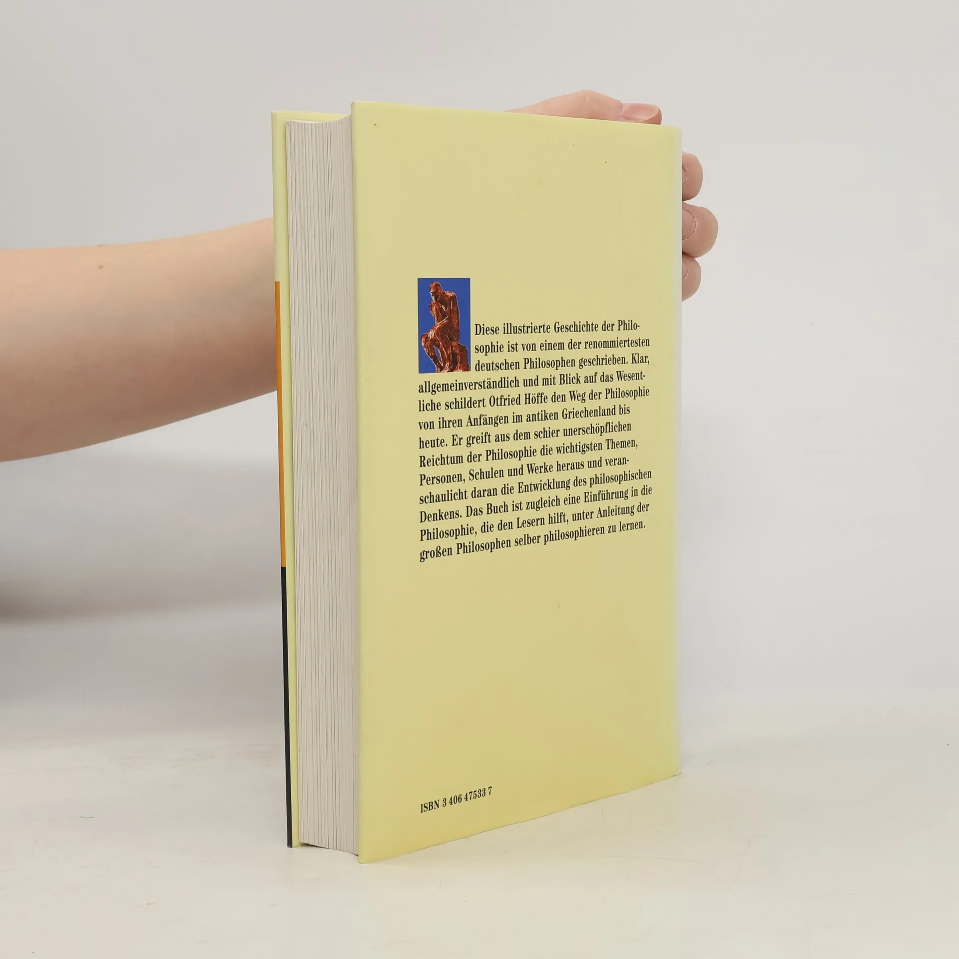 Diese kurzgefaßte Geschichte der Philosophie von einem der renommiertesten deutschen Philosophen ist als illustrierte Ausgabe erstmals im Jahre 2001 erschienen. Für die preisgünstige Paperback-Ausgabe wurde der Text neu überarbeitet. Klar, anschaulich und mit Blick auf das Wesentliche schildert Otfried Höffe den Weg der Philosophie von den Anfängen im antiken Griechenland bis heute. Das Buch ist eine Einführung in die Philosophie mit dem Ziel, daß der Leser unter Anleitung der großen Philosophen selber zu philosophieren lerne.