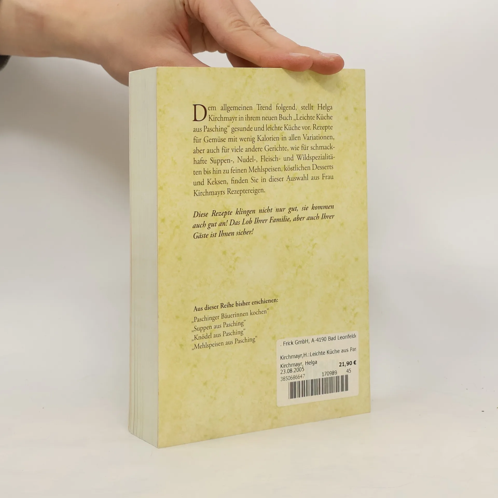 Dem allgemeinen Trend folgend, stellt Helga Kirchmayr in ihrem neuen Buch „Leichte Kost aus Pasching“ gesunde und leichte Küche vor. Rezepte für Gemüse mit wenig Kalorien in allen Variationen, aber auch für viele andere Gerichte, wie Anleitungen für schmackhafte Suppen-, Nudel-, Fleisch- und Wildspezialitäten bis hin zu feinen Mehlspeisen, köstlichen Desserts und Keksen, finden sie in dieser Auswahl aus Frau Kirchmayrs Rezeptereigen. Diese Rezepte klingen nicht nur gut, sie kommen auch gut an! Das Lob Ihrer Familie, aber auch Ihrer Gäste ist Ihnen sicher! Bisher von ihr erschienen: „Paschinger Bäuerinnen kochen“ (gemeinsam mit den Paschinger Bäuerinnen) mit den besten traditionellen Rezepten aus privater Überlieferung sowie die Bände „Suppen aus Pasching“, „Knödel aus Pasching“ und „Mehlspeisen aus Pasching“