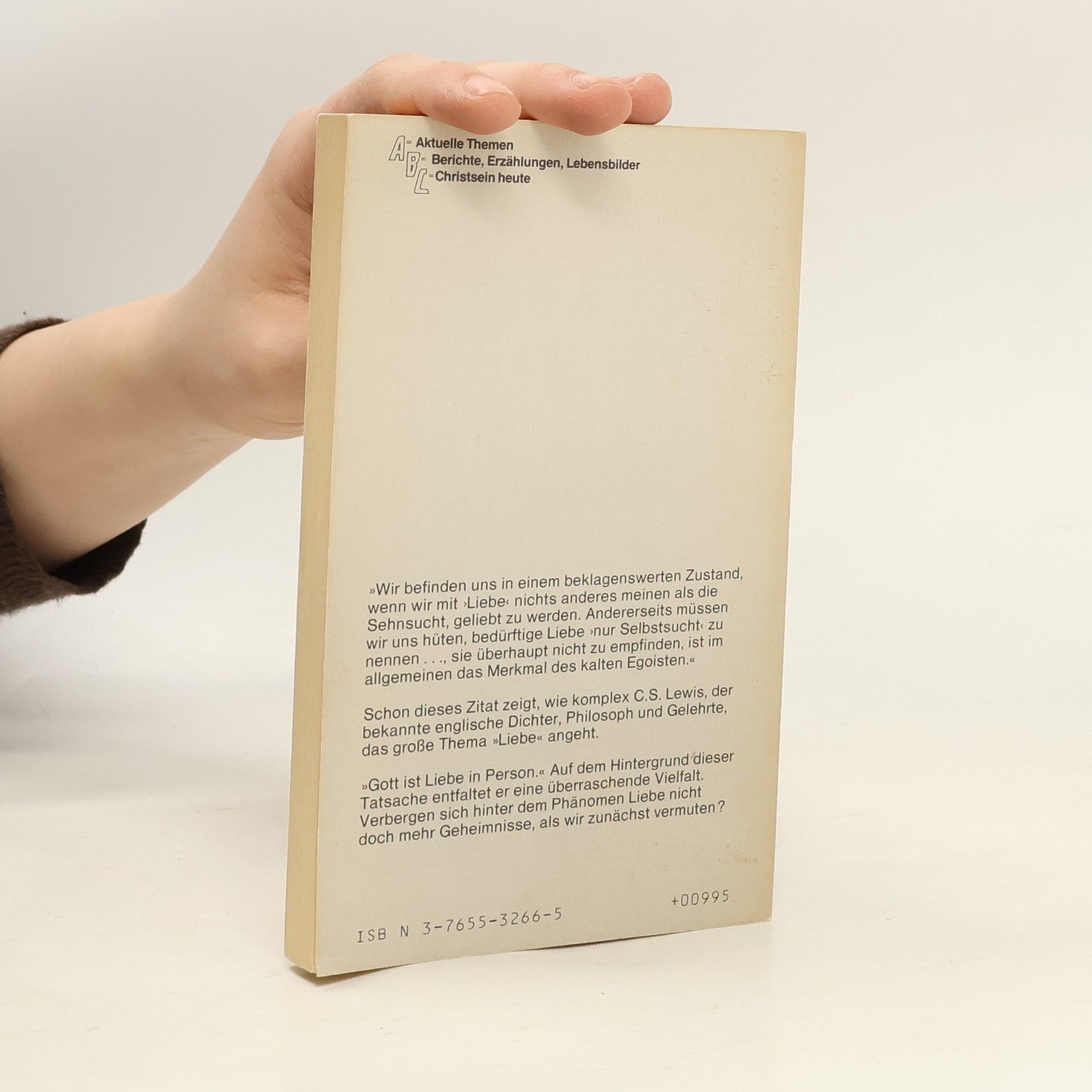 C. S. Lewis schreibt: «Wir befinden uns in einem beklagenswerten Zustand, wenn wir mit ‹Liebe› nichts anderes meinen als die Sehnsucht, geliebt zu werden. Andererseits müssen wir uns hüten, bedürftige Liebe ‹nur› Sehnsucht zu nennen … Sie überhaupt nicht zu empfinden, ist im Allgemeinen das Merkmal des kalten Egoisten.» Gott ist Liebe in Person. Auf dem Hintergrund dieser Tatsache entfaltet Lewis eine überraschende Vielfalt. Denn hinter dem Phänomen Liebe verbergen sich doch mehr Geheimnisse, als wir zunächst vermuten. Liebe ist eben nicht nur «Eros», die geschlechtliche Liebe. Nein, Freundschaft und Zuneigung gehören genauso dazu wie «Agape» – die göttliche, die bedingungslose Liebe. Was man genau darunter zu verstehen hat, erfährt man in diesem beeindruckenden Longseller.
