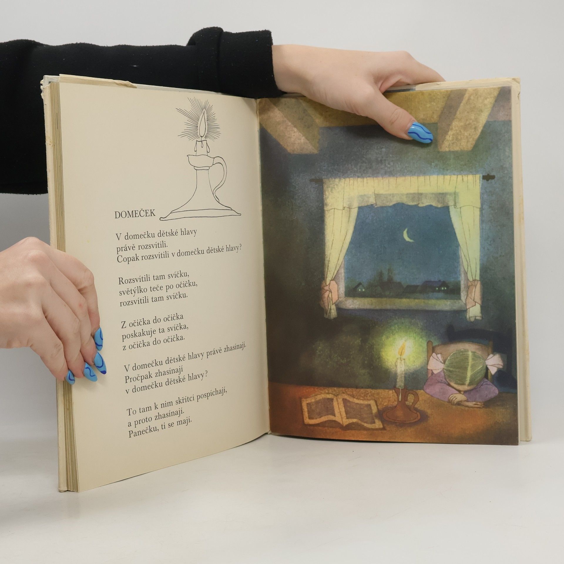 Mistr básnického slova a mistr štětce se sešli, aby dětem zazpívali malou noční hudbu slov a barev do usínání. Najdeme tu verše o nebi, o světě, o jaru, o květinách, o vlaštovkách, o svatbě svatojánských mušek, o Meluzíně, o střechýlu aj., které učí děti vnímat pozorně okolní svět a nacházet stále něco nového. (Praha 1972, 4. vydání v Albatrosu. Předcházející vydání vyšla pod názvem Halas dětem.)