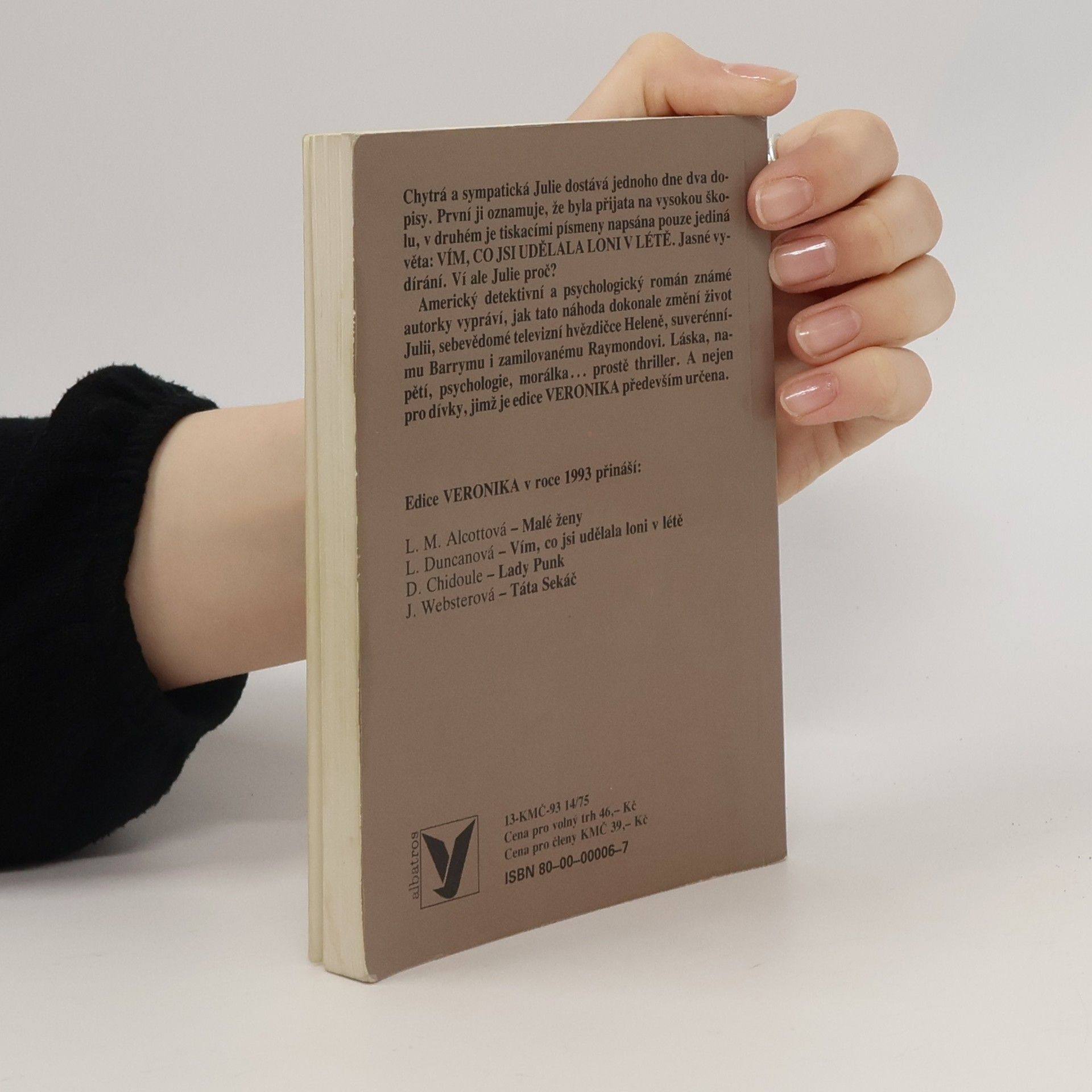 Americký detektivní a psychologický román pro dívky ukazuje, jak vydírání dokonale změní život . Chytrá a sympatická Julie dostává jednoho dne dva dopisy. První jí oznamuje, že byla přijata na vysokou škoĺu, v druhém je tiskacími písmeny napsaná pouze jediná věta : VÍM, CO JSI UDĚLALA LONI V LÉTĚ. Láska, napětí, psychologie, morálka....prostě thriller. A nejen pro dívky, jimž je edice VERONIKA především určena.... celý text