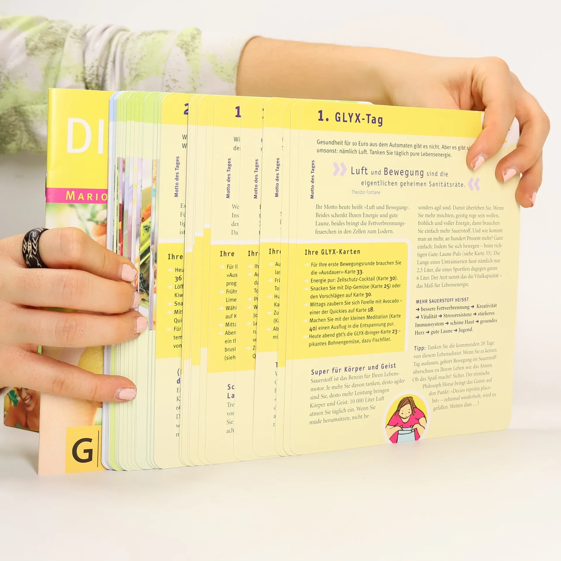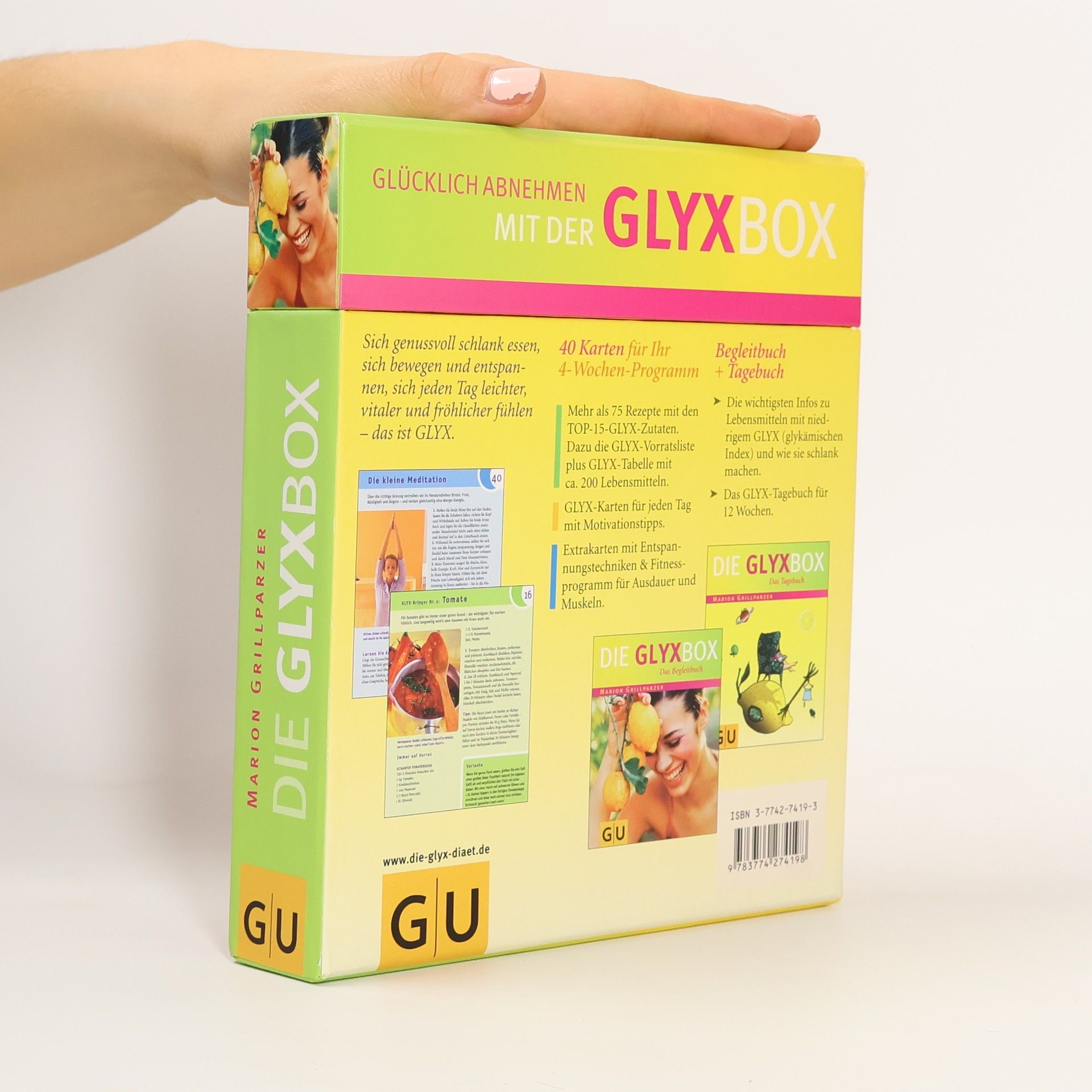 - GLYX – oder die Kunst, glücklich abzunehmen. Denn Sie essen, ohne zu hungern. In der Box finden die Leserinnen ihr detailliertes 4-Wochen-Programm: - Die GLYX-Tageskarten geben Anregung für den Tagesablauf - vom Aufstehritual und Frühstück über Bewegungs- und Entspannungsprogramm bis hin zu kleinen Helfern wie Entgiftungs-Elexieren und GLYX-Trink-Regeln. - Die Rezeptkarten für die TOP 14 der GLYX-Zutaten bieten über 40 neue Vorschläge für Hauptgerichte sowie rund 60 “Quick”-Anleitungen für alle anderen Mahlzeiten. - Die GLYX-Sonderkarten widmen sich u. a. den Themen: Bewegungsprogramm (7 Karten), Dehnung, Entspannung, Tipps zur Vorratshaltung. - Das GLYX-Buch stellt die wichtigsten GLYX-Regeln vor, erklärt, wie die Karten verwendet werden und hat einen ausführlichen Tagebuchteil, in dem die Leserinnen drei Monate lang ihre Ergebnisse eintragen – zur Kontrolle, und vor allem zur eigenen Motivation