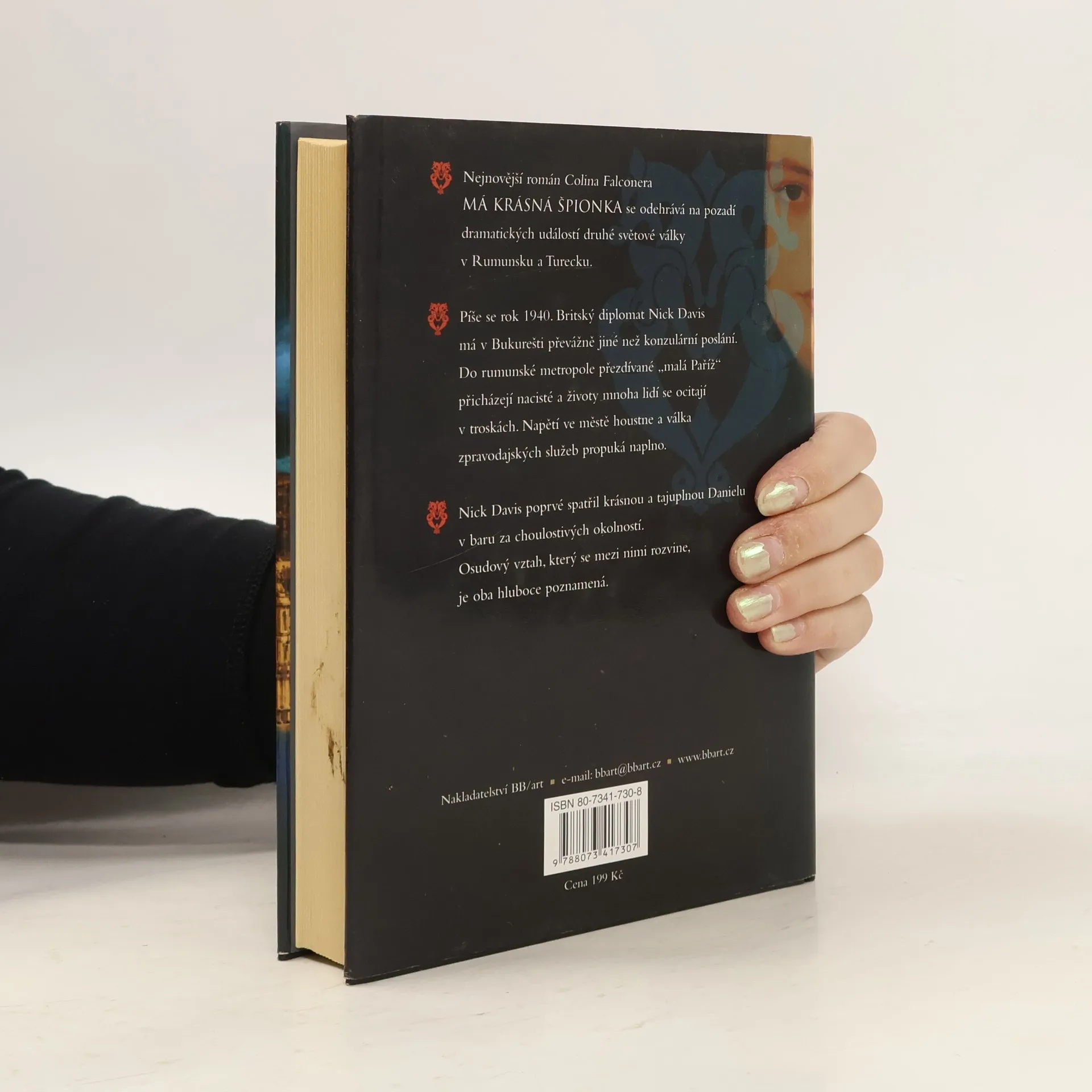 Nejnovější román Colina Falconera Má krásná špionka se odehrává na pozadí dramatických událostí druhé světové války v Rumunsku a Turecku. Píše se rok 1940. Britský diplomat Nick Davis má v Bukurešti převážně jiné než konzulární poslání. Do rumunské metropole přezdívané „malá Paříž“ přicházejí nacisté a životy mnoha lidí se ocitají v troskách. Napětí ve městě houstne a válka zpravodajských služeb propuká naplno. Nick Davis poprvé spatřil krásnou a tajuplnou Danielu v baru za choulostivých okolností. Osudový vztah, který se mezi nimi rozvine, je oba hluboce poznamená. Vypjatá atmosféra vrcholící druhé světové války, rodící se nepřátelství mezi Sověty a ostatními členy protihitlerovské aliance a snaha Německa uzavřít separátní mír jsou víc než jen pouhou kulisou dalšího Falconerova románu. Snad ani není třeba dodávat, že autor se i tentokrát věrně drží historických reálií, aniž by tím nějak utrpěla čtivost. Velmi snadno si lze představit, že Nick Davis, krásná Daniela, konvencemi sešněrovaný britský konzul a otrlý anglický válečný zpravodaj Max King by při čtení Falconerova románu udiveně vrtěli hlavou a marně si lámali hlavu otázkou: Jak to ten chlap ví? Vždyť jsem o tom nikomu neřekl. Děj románu Má krásná špionka lze výstižně shrnout čtyřmi slovy: láska, zrada, tajemství, nebezpečí.