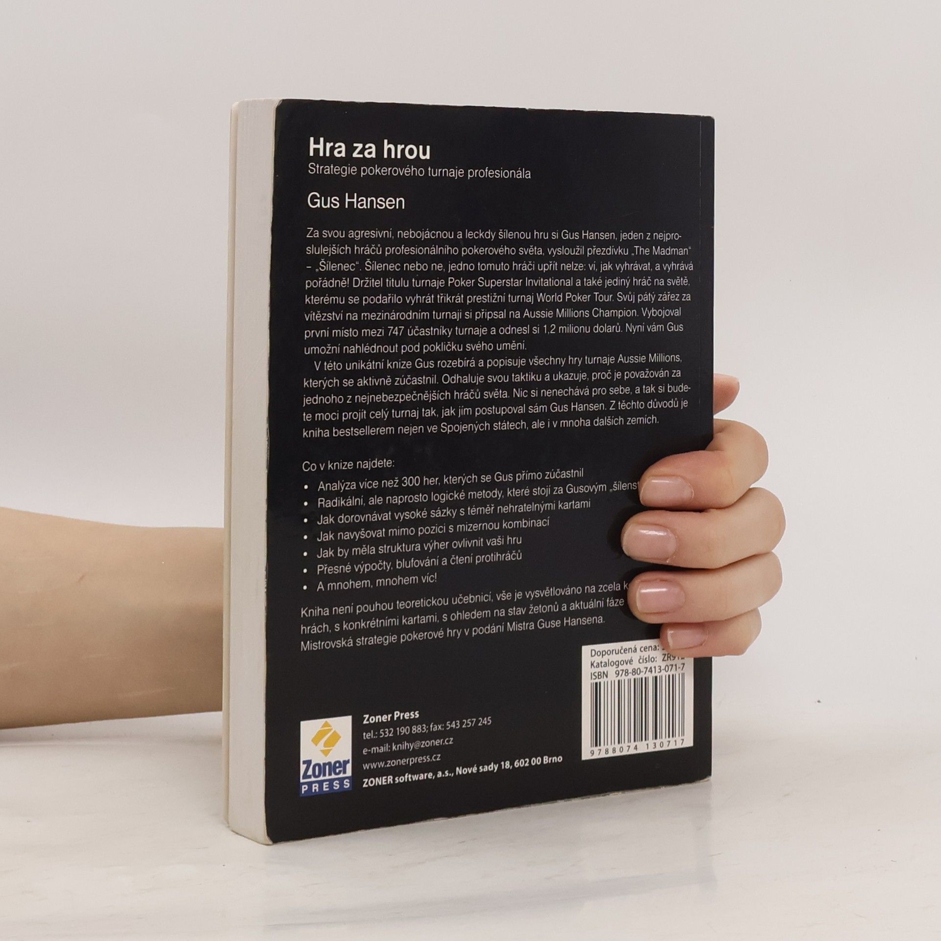 Jméno Gus Hansen je v pokerovém světě synonymem pro agresivní hru a neustálý tlak na protihráče. Tento renomovaný profesionální hráč, jediný s třemi tituly World Poker Tour, se ve své knize rozhodl podělit o taktiky a strategie, které z něj činí jednoho z nejobávanějších hráčů. Kniha se od ostatních pokerových učebnic odlišuje tím, že není klasickou učebnicí. Gus zvolil cestu názorných příkladů a popisuje svůj postup v turnaji Aussie Millions. Každou hru detailně rozebírá a vysvětluje svá rozhodnutí, což přispělo k jejímu úspěchu jako bestselleru. Na více než 300 hrách ukazuje, jak se pohybovat od začátku turnaje až po závěrečnou heads-up část. Naučíte se, jak postupovat v jednotlivých fázích turnaje v Texas Hold’em, jak využít strachu protihráčů, efektivně krást povinné sázky, správně používat continuation bet a zohlednit výšku výhry ve strategii. Dále se dozvíte o důležitosti matematiky, jak hrát proti různým typům hráčů, kdy hrát agresivně a kdy se držet zpátky, jak využít all-in a jak se rychle rozhodovat v těžkých situacích. A především, jak vyhrávat turnaje!