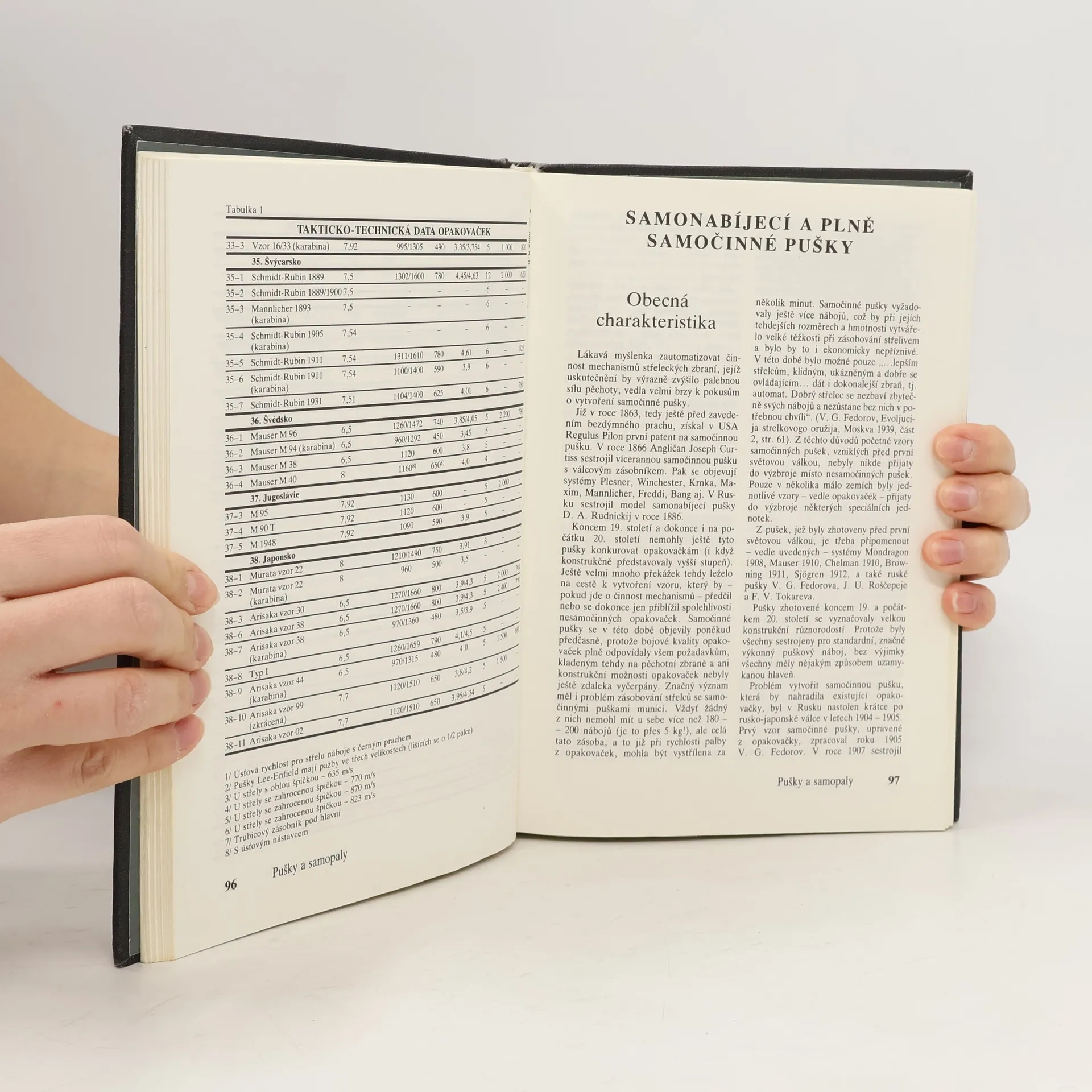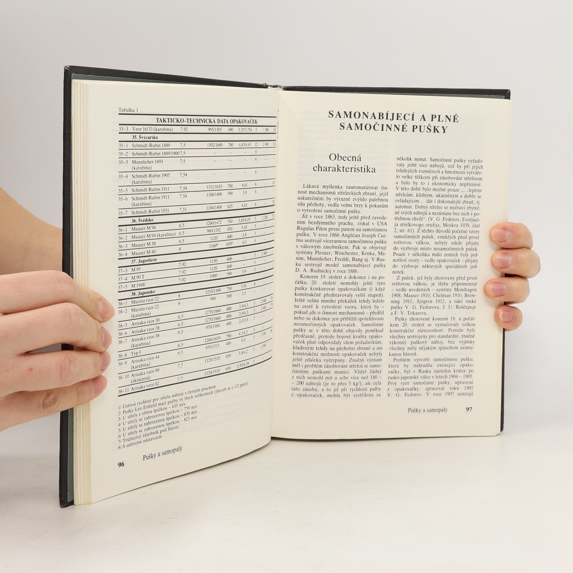 Kniha Pušky a samopaly je rozdělena do tří částí. V první jsou popsány a vyobrazeny opakovačky a samočinné pušky první generace, používající puškové náboje a sestrojené ještě koncem 19. století. Druhá část knihy je věnována samopalům, které se značně rozšířily v období druhé světové války a jejichž zdokonalování pokračuje dodnes. Třetí část hovoří o samočinných puškách druhé generace - automatech (útočných puškách) - současně nejrozšířenější střelecké zbrani, nacházející se ve výzbroji mnoha států a používající většinou náboje střední nebo snížené balistické výkonnosti. Jsou zde popsány i nepříliš početné vzory samočinných karabin z poválečného období. Přílohy obsahují údaje popisující používané náboje a ráže střeleckých zbraní, nábojové pásky a nábojové rámečky, bodáky a další dodatky.... celý text