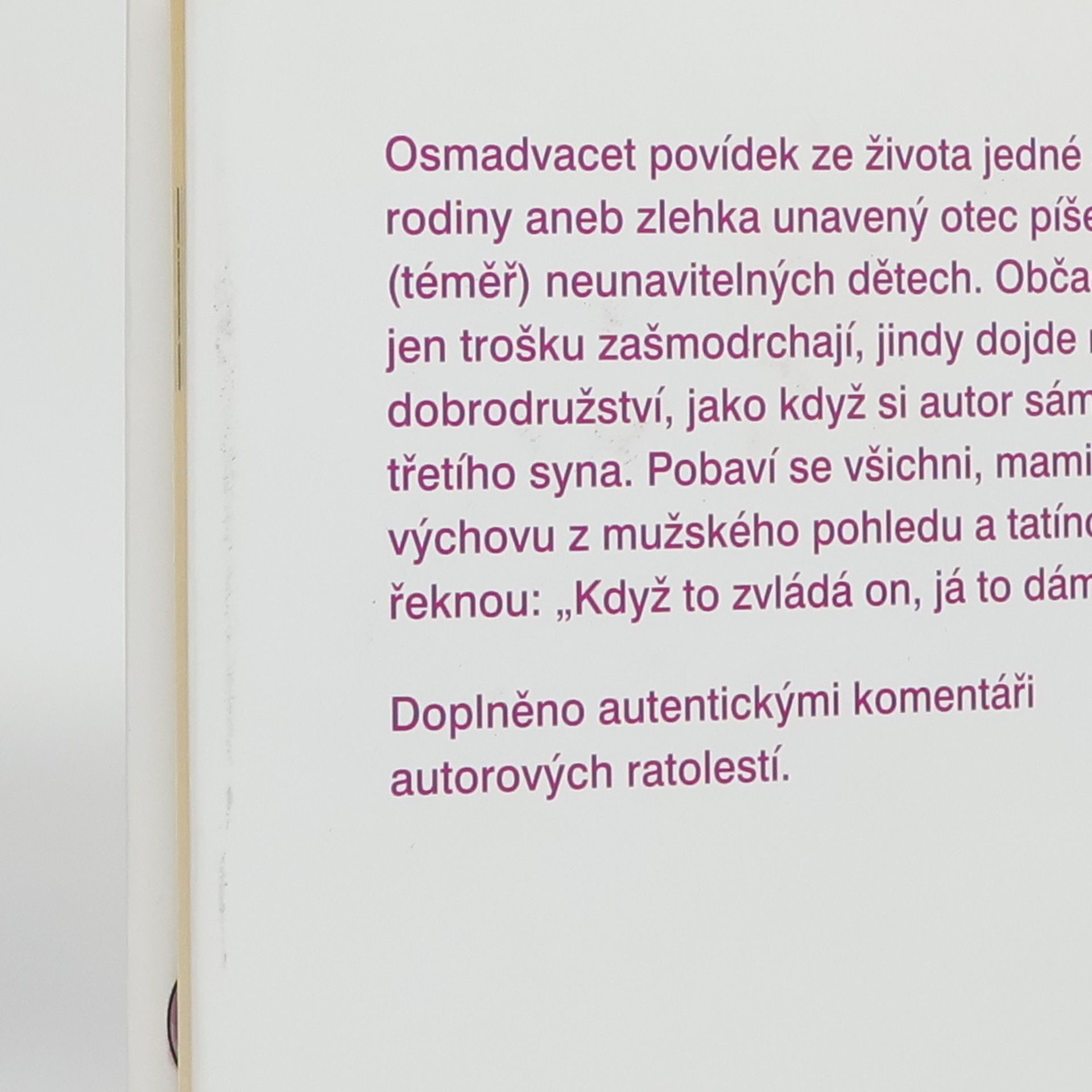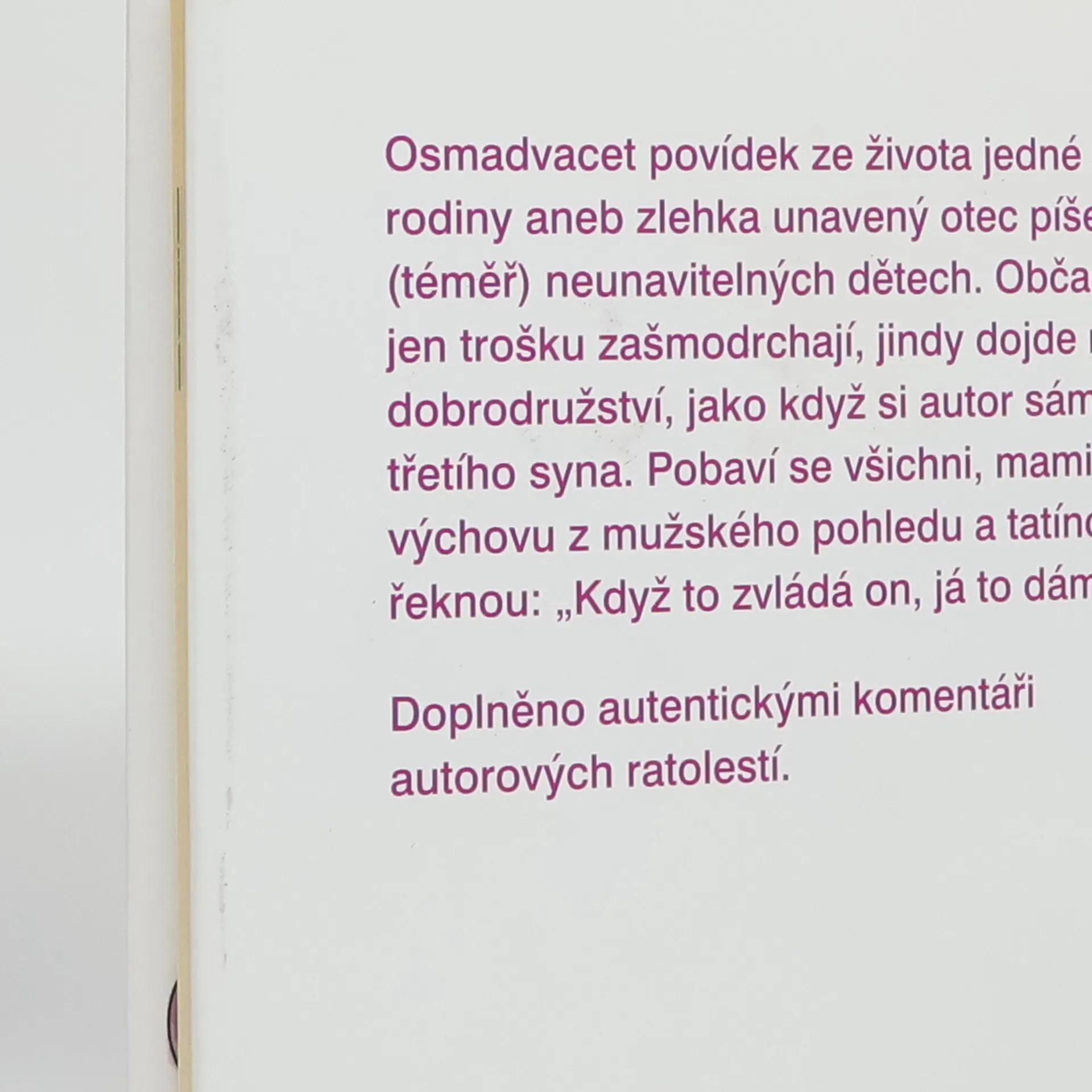 Osmadvacet povídek ze života jedné šestičlenné rodiny aneb zlehka unavený otec píše o svých (téměř) neunavitelných dětech. Občas se věci jen trošku zašmodrchají, jindy dojde na pořádné dobrodružství, jako když si autor sám odrodil třetího syna. Pobaví se všichni, maminky poznají výchovu z mužského pohledu a tatínci si třeba řeknou: „Když to zvládá on, já to dám taky.“ Doplněno autentickými komentáři autorových ratolestí.