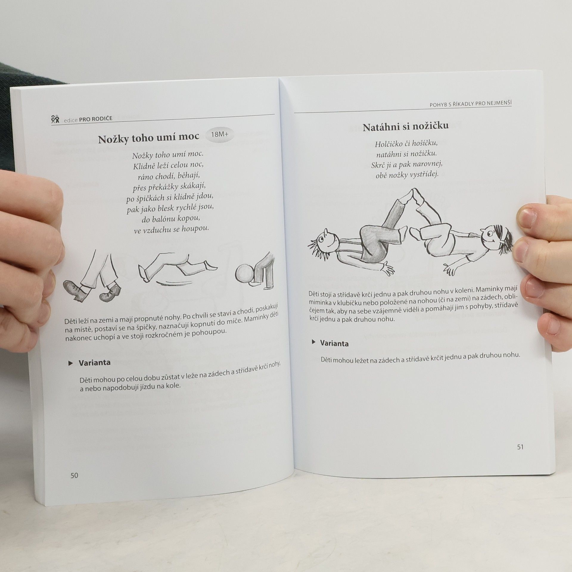 Již v prenatálním období můžeme u dětí pozorovat pohybové aktivity, které se po narození dále rozvíjejí. Přinášíme vám proto knihu plnou námětů, říkanek a praktických ukázek, jak vést své ratolesti zajímavou formou k pohybu již od útlého věku. Ptáte se, jaký mají říkanky vliv na rozvoj pohybových vlastností? Význam říkanek není pouze v tom, že je s nimi cvičení pro děti veselejší, ale i ve velkém vlivu na psychický vývoj dítěte. Děti se díky nim učí snáze mluvit a osvojí si rytmus řeči, který je tak potřebný pro získávání školních dovedností, zejména psaní a čtení. Doufáme, že se vám říkanky budou líbit a přejeme vám mnoho úspěchů při cvičení s vašimi dětmi.