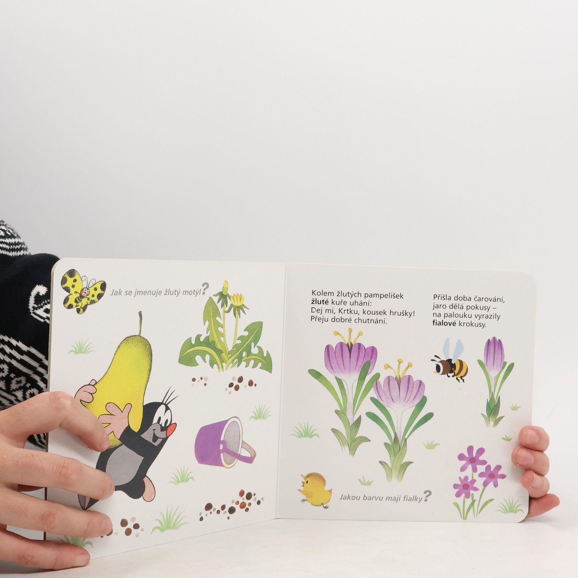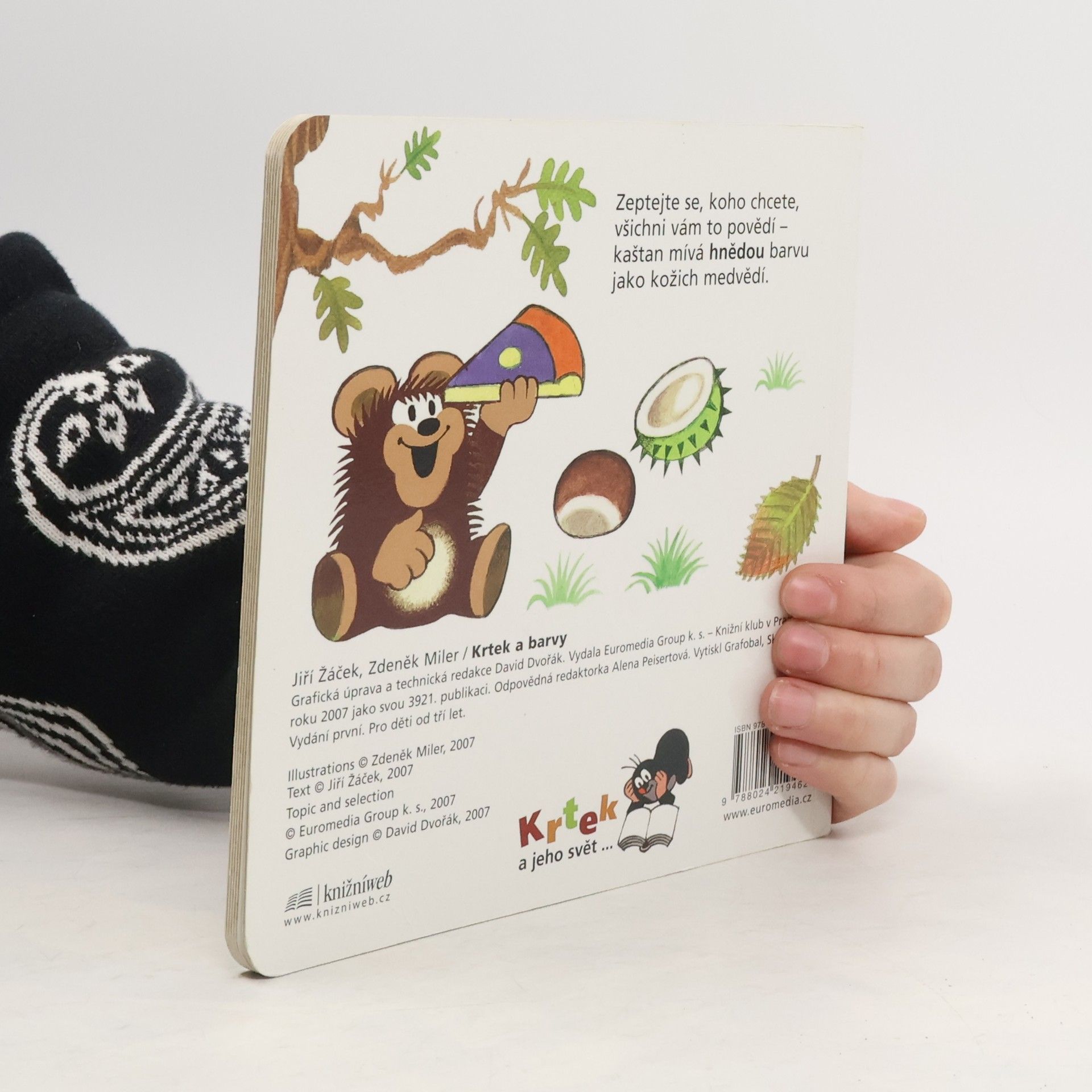 Čtvrtý svazek poznávací řady leporel zavede nejmenší čtenáře do světa barev. S hravými obrázky Zdeňka Milera a jednoduchými vtipnými verši Jiřího Žáčka se děti naučí rozlišovat jednotlivé barvy, které nás obklopují. Učitelem v této škole pro nejmenší je oblíbený Krteček, který si připravil - společně s pejskem, žabkou, mravenečkem, zajícem, medvědem a dalšími kamarády - pro své malé žáčky zvídavé otázky.