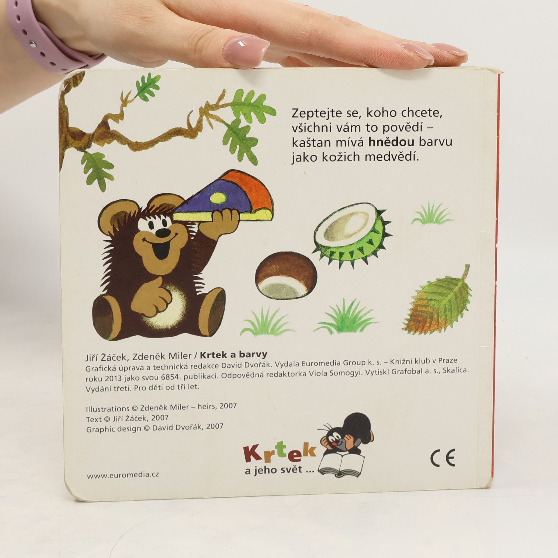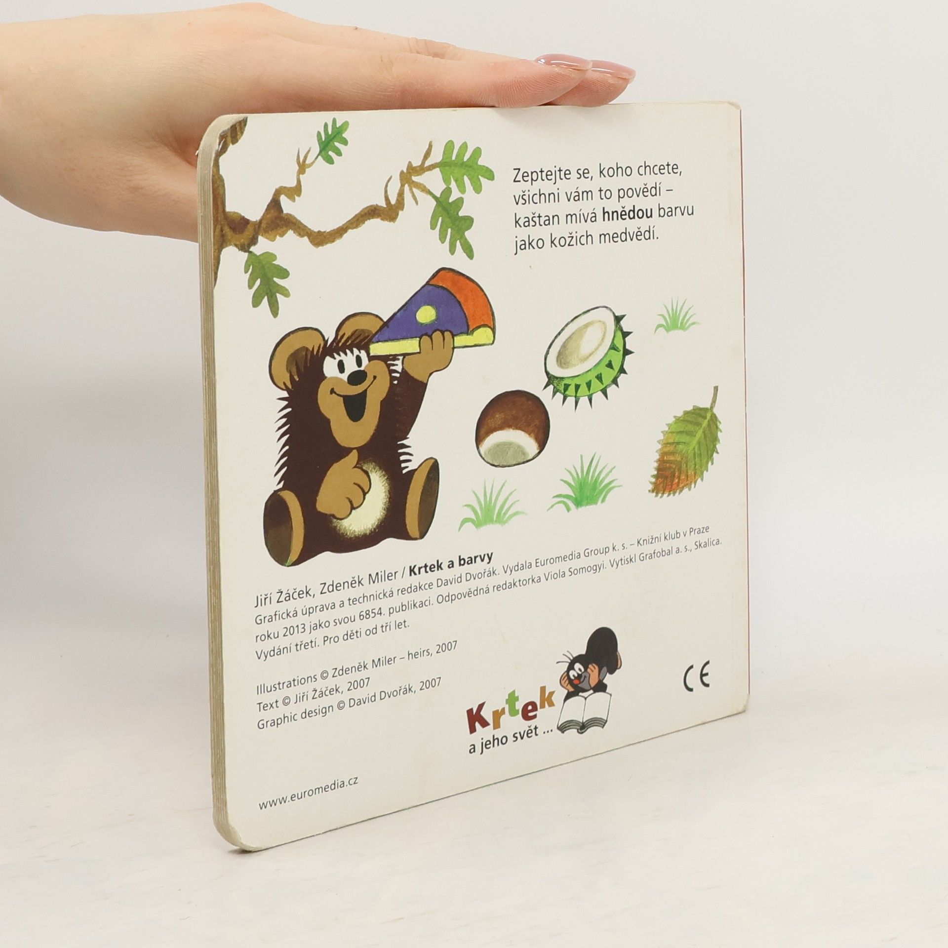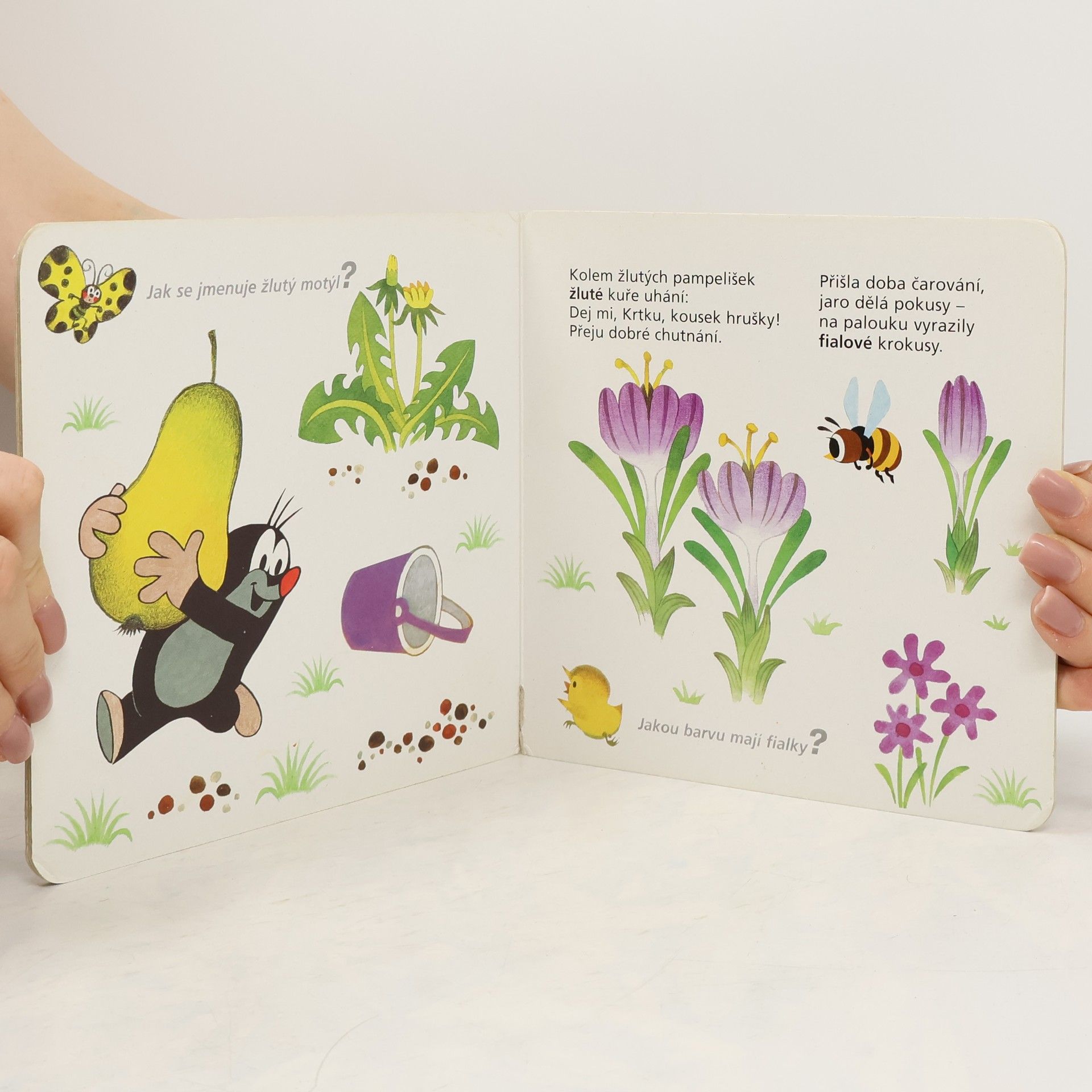 Čtvrtý svazek poznávací řady leporel zavede nejmenší čtenáře do světa barev. S hravými obrázky Zdeňka Milera a jednoduchými vtipnými verši Jiřího Žáčka se děti naučí rozlišovat jednotlivé barvy, které nás obklopují. Učitelem v této škole pro nejmenší je oblíbený Krteček, který si připravil - společně s pejskem, žabkou, mravenečkem, zajícem, medvědem a dalšími kamarády - pro své malé žáčky zvídavé otázky.