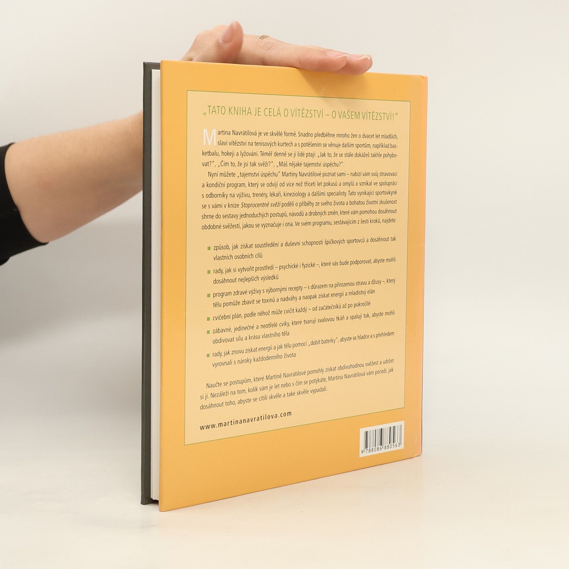 Tato kniha se zaměřuje na vítězství - vaše vítězství! Martina Navrátilová, ve skvělé formě, předbíhá ženy o dvacet let mladší a užívá si nejen tenis, ale i další sporty jako basketbal, hokej a lyžování. Lidé se jí často ptají na tajemství její svěžesti a úspěchu. Nyní máte možnost poznat její "tajemství" prostřednictvím stravovacího a kondičního programu, který vznikal více než třicet let a byl vytvořen ve spolupráci s odborníky. Navrátilová sdílí příběhy ze svého života a shrnuje bohaté zkušenosti do jednoduchých postupů, které vám pomohou dosáhnout podobné svěžesti. Její program zahrnuje šest kroků: metody pro zlepšení soustředění a duševních schopností, rady pro vytvoření podpůrného prostředí, zdravou výživu s recepty zaměřenými na přirozenou stravu, cvičební plán pro všechny úrovně, unikátní cviky pro tvarování svalů a tipy na obnovení energie. Naučte se postupy, které Martině pomohly udržet obdivuhodnou svěžest. Bez ohledu na věk nebo výzvy, které čelíte, vám poskytne rady, jak se cítit skvěle a vypadat skvěle.