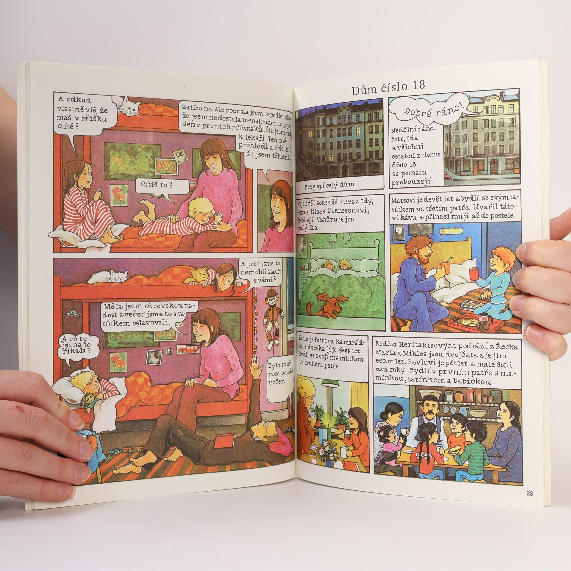 Didaktický comics, který dětem přístupnou a naprosto otevřenou formou vysvětluje proces rozmnožování, od okamžiku početí až po porod a následnou starostlivost o malé dítě. Rodina Lindströmových bude mít miminko. Petr a jeho starší sestra Ida se na ně moc těší. Oba jsou hrozně zvědaví, zda to bude bratříček, nebo sestřička. Celá rodina společně prožívá období maminčina těhotenství. Obě děti také pochopitelně kladou svým rodičům otázky, co narození dítěte předchází a nechávají si pak od tatínka vyprávět, jaké to bylo v porodnici. Když se maminka s miminkem vrátí, mají všichni obrovskou radost. Petr a Ida poznávají, co znamená péče o takové miminko. Každodenní život jejich rodiny je od té doby naplněn něčím novým... Pro dospělé to nebývá vždy právě jednoduché odpovídat bez zábran a pravdivě na dotěrné otázky týkající se sexuality. Tato knížka by proto měla pomoci také rodičům, aby na takové otázky byli připraveni a aby dokázali své děti uspokojit přímými a otevřenými odpověďmi. Zvolili jsme formu obrázkového příběhu, protože je dětem blízká. Její výhoda spočívá v tom, že si knihu mohou prohlížet i děti, které dosud neumějí číst. Doporučujeme však rodičům, aby si knížku nejprve přečetli sami, a teprve potom ji s dětmi společně probrali. Tato knížka jistě pomůže překonat zbytečný výchovný ostych a zaplnit jistá bílá místa, jež u nás zatím v sexuální výchově přetrvávají.