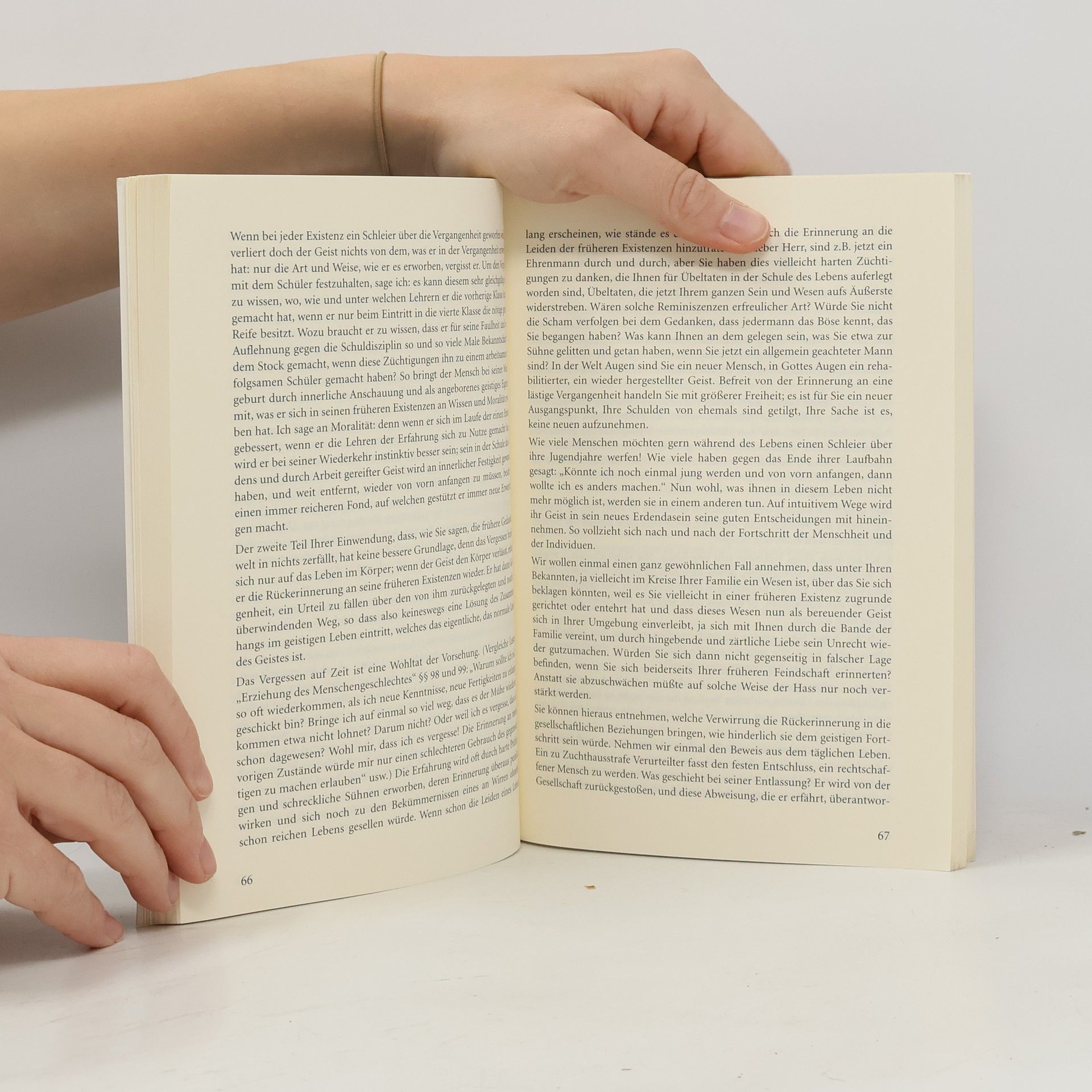 „Die geistige Welt hat eine Art die Dinge zu beurteilen, die nicht immer mit der unseren identisch ist. Ihr Sehen, Denken und Handeln beruht auf anderen Elementen. Während unser Ausblick auf die Materie beschränkt und durch den engen Kreis begrenzt ist, in dessen Mitte wir uns befinden. Sie umfassen das Ganze, für sie ist die Zeit, die uns so lange erscheint, nur ein Augenblick, die Ferne nur ein Schritt. Einzelne Dinge, die uns ungemein wichtig vorkommen, sind in ihren Augen Kindereien, wogegen sie Dinge für wichtig erachten, deren Tragweite wir nicht zu erfassen mögen.“