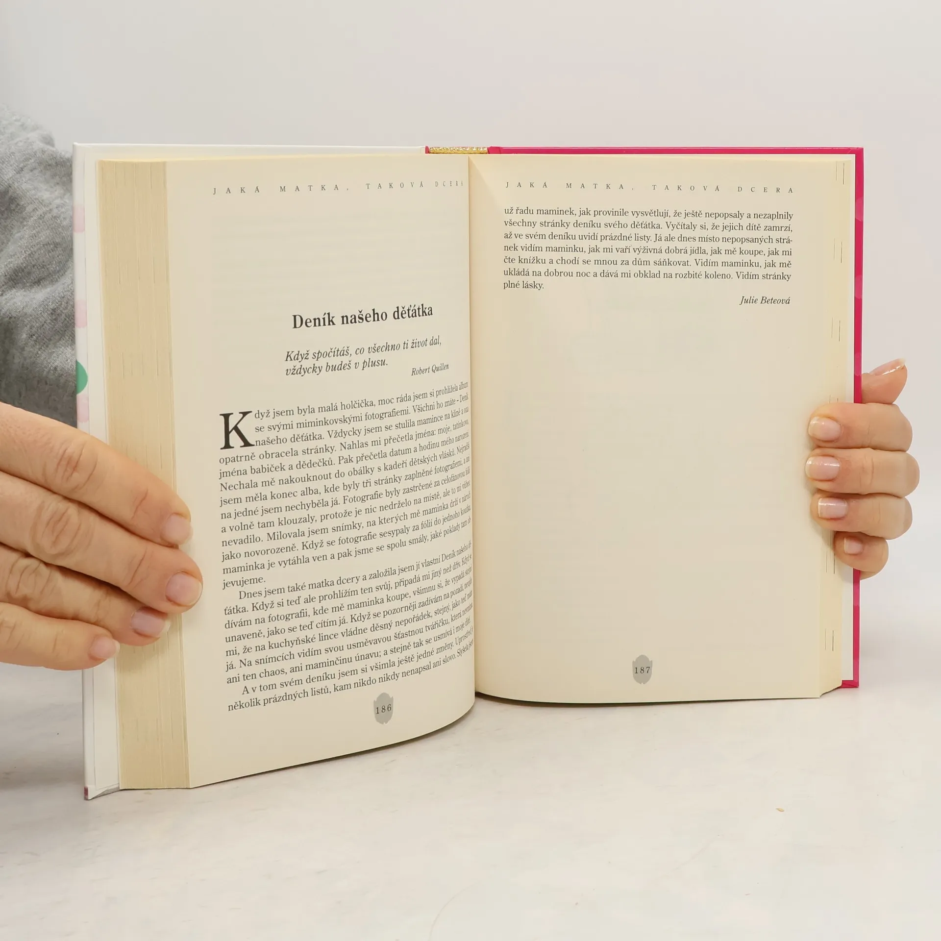 Soubor krátkých příběhů ze života obsahuje širokou škálu variací na téma vztahu mezi matkou a dcerou, zachycené prostými čtenáři i známými autory. Příspěvky ve sborníku zdůrazňují výjimečnost zvláštního pouta mezi matkou a dcerou, které v mezilidských vztazích nejčastěji vystihuje posloupnost generací a který v průběhu života prochází řadou proměn, kladných či záporných. Všechny příběhy, humorné i sentimentální, zdůrazňují jednotlivé etapy těchto vztahů, třecí plochy a generační rozpory, většinou ale uvádějí příklady mateřské lásky, schopnosti odpouštět a vůle po překonání neshod. Kniha patří k souboru optimisticky laděných knih, jejichž cílem je upozornit na rozmanitost mezilidských vztahů.