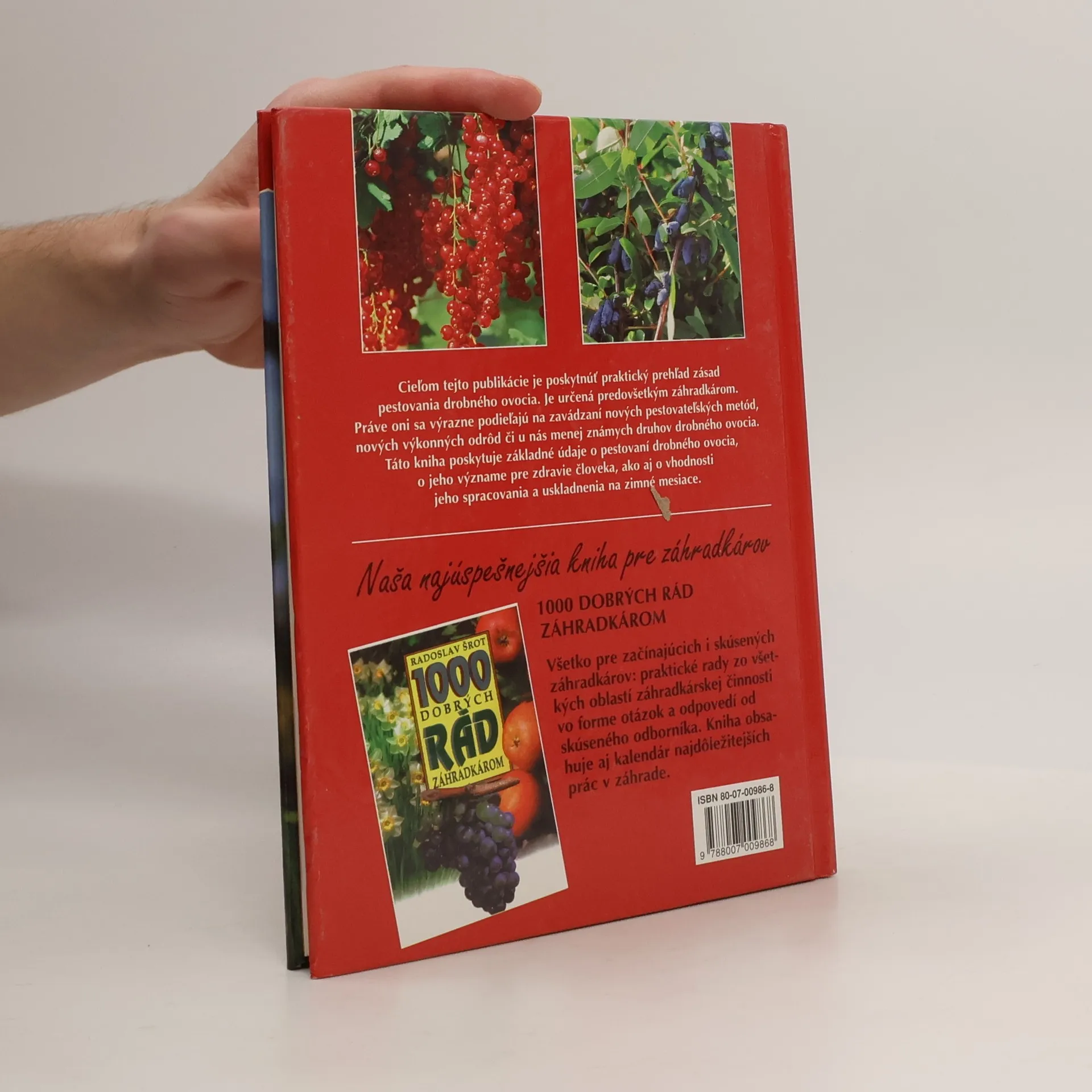 Cieľom tejto publikácie je poskytnúť praktický prehľad zásad pestovania drobného ovocia. Je určená predovšetkým záhradkárom. Práve oni sa výrazne podieľajú na zavádzaní nových pestovateľských metód, nových výkonných odrôd či u nás menej známych druhov drobného ovocia. Táto kniha poskytuje základné údaje o pestovaní drobného ovocia, o jeho význame pre zdravie človeka, ako aj o vhodnosti jeho spracovania a uskladnenia na zimné mesiace. Obsah: Radosť z pestovania drobného ovocia, Drobné ovocie - istota v každoročnej úrodnosti, Deti najviac obľubujú drobné ovocie, Koľko výpestkov drobného ovocia stačí pre štvorčlennú rodinu ?, Biologická charakteristika a opeľovanie, Vhodné miesta v záhradke, Ríbezle (biele, červené, čierne), Egreše, Josta, Maliny, Ostužiny (černice), Jahody, Menej známe ovocné druhy, Zemolez, Arónia, Baza čierna, Rakytník rešetliakovitý, Plodové ruže, Jarabina, Čučoriedka, Brusnica, Spracovanie drobného ovocia.