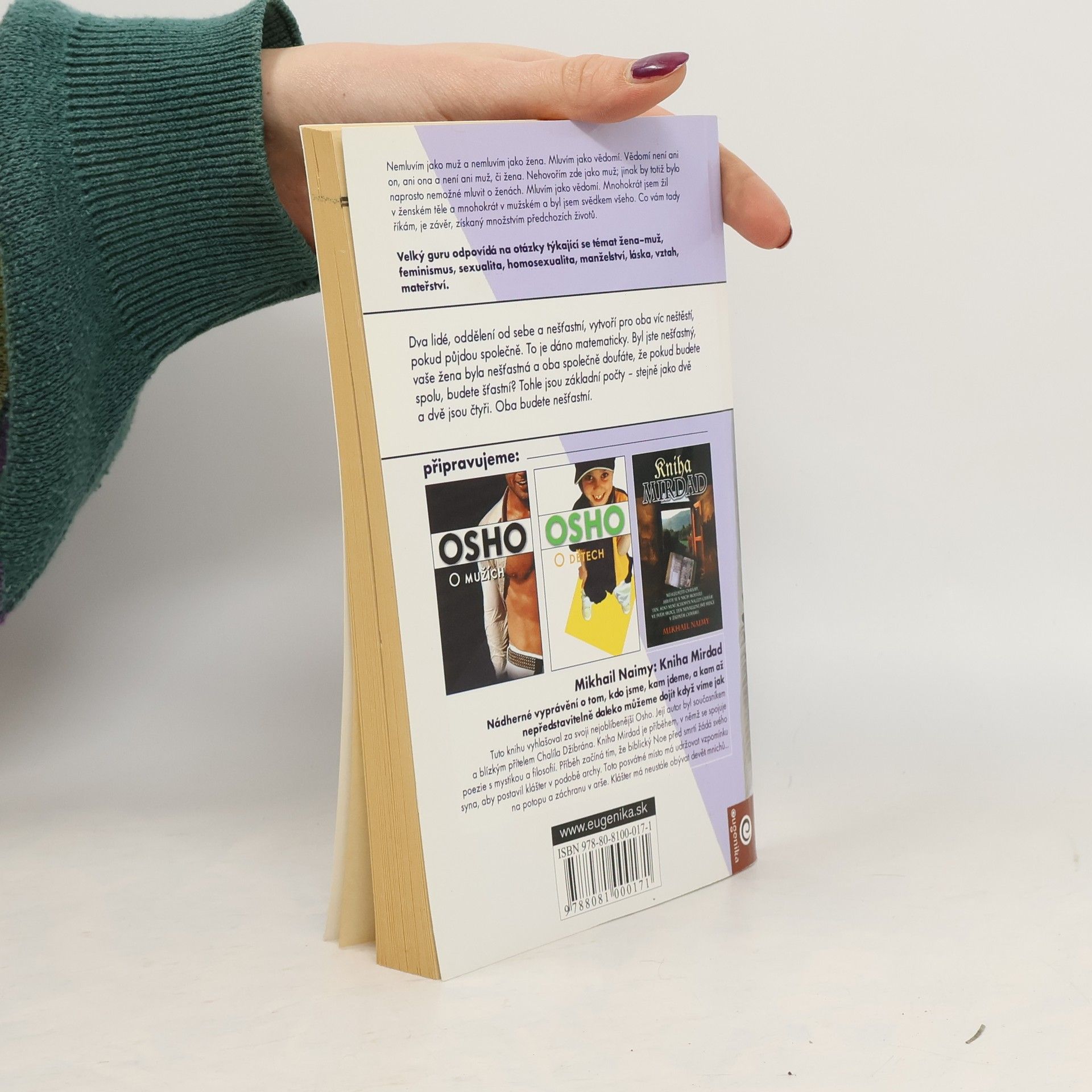 Velký guru odpovídá na otázky týkající se témat žena-muž, feminismus, sexualita, homosexualita, manželství, láska, vztah, mateřství. "Když si milenci navzájem říkají - nemůžu bez tebe žít, není to o tom, že by se podváděli, myslí to vážně. Ale neznají podstatu života. Zítra to bude tatáž žena, ale nebude vypadat tak krásně. A v průběhu dalších dní se oba, muž i žena, budou cítit uvězněni."
