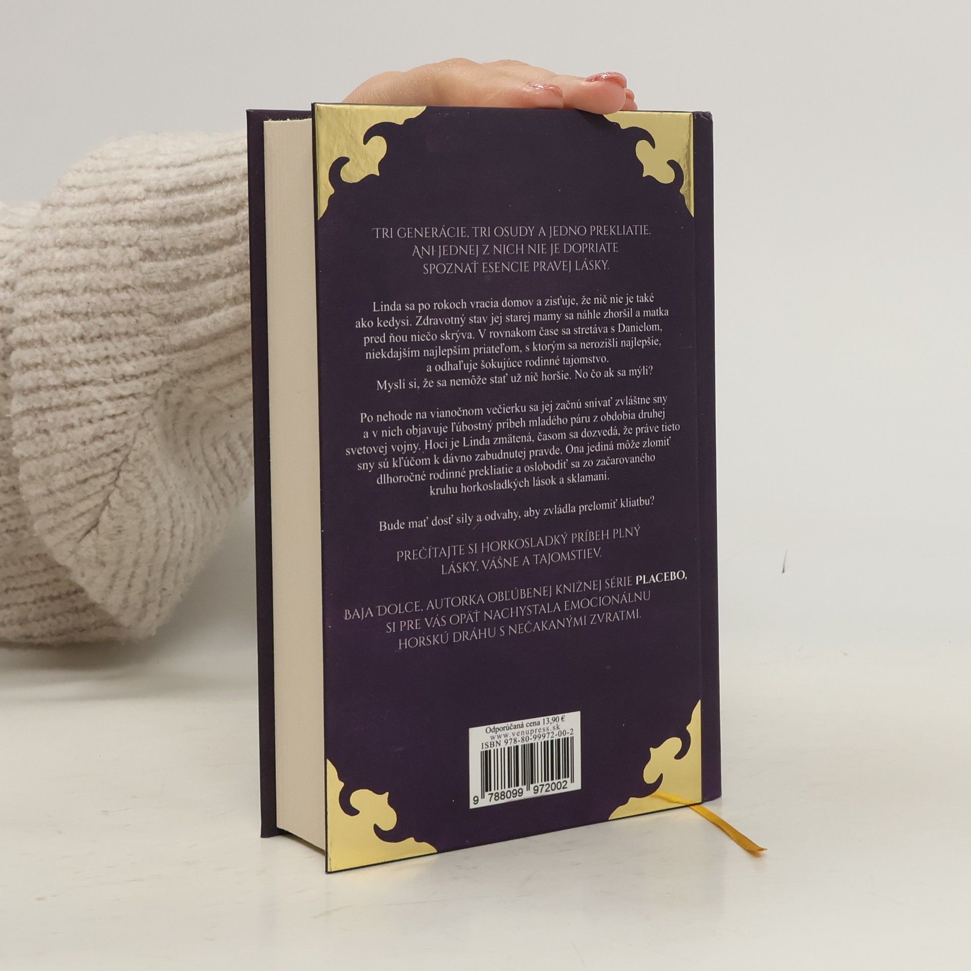 Tri generácie, tri osudy a jedno prekliatie. Ani jednej z nich nie je dopriate spoznať esencie pravej lásky. Linda sa po rokoch vracia domov a zisťuje, že nič nie je také ako kedysi. Zdravotný stav jej starej mamy sa náhle zhoršil a matka pred ňou niečo skrýva. V rovnakom čase sa stretáva s Danielom, niekdajším najlepším priateľom, s ktorým sa nerozišli najlepšie, a odhaľuje šokujúce rodinné tajomstvo. Myslí si, že sa nemôže stať už nič horšie. No čo ak sa mýli? Po nehode na vianočnom večierku sa jej začnú snívať zvláštne sny a v nich objavuje ľúbostný príbeh mladého páru z obdobia druhej svetovej vojny. Hoci je Linda zmätená, časom sa dozvedá, že práve tieto sny sú kľúčom k dávno zabudnutej pravde. Ona jediná môže zlomiť dlhoročné rodinné prekliatie a oslobodiť sa zo začarovaného kruhu horkosladkých lások a sklamaní. Bude mať dosť sily a odvahy, aby zvládla prelomiť kliatbu? Prečítajte si horkosladký príbeh plný lásky, vášne a tajomstiev. Baja Dolce, autorka obľúbenej knižnej série Placebo, si pre vás opäť nachystala emocionálnu horskú dráhu s nečakanými zvratmi.