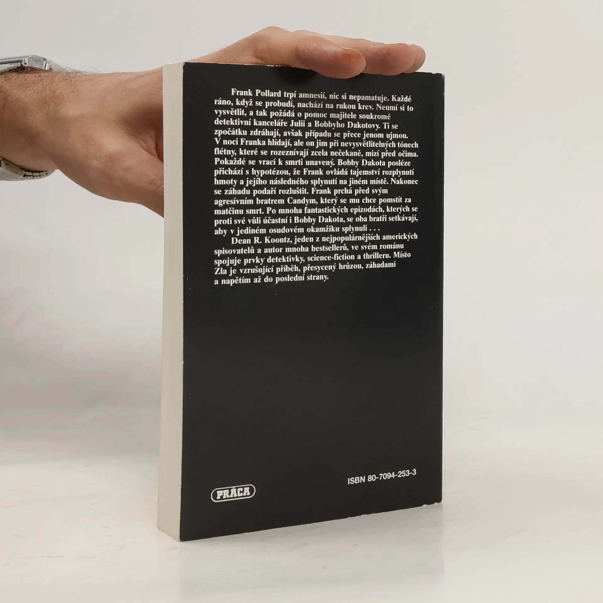 Frank Pollard trpí amnesií, nic si nepamatuje. Každé ráno, když se probudí, nachází na rukou krev. Neumí si to vysvětlit, a tak požádá o pomoc majitele soukromé detektivní kanceláře Julii a Bobbyho Dakotovy. Ti se zpočátku zdráhají, avšak případu se přece jenom ujmou. V noci Franka hlídají, ale on jim při nevysvětlitelných tónech flétny, které se rozeznívají zcela nečekaně, mizí před očima... Dean R. Koontz, jeden z nejpopulárnějších amerických spisovatelů a autor mnoha bestsellerů, ve svém románu spojuje prvky detektivky, science-fiction a thrilleru. Místo Zla je vzrušující příběh, přesycený hrůzou, záhadami a napětím až do poslední strany.