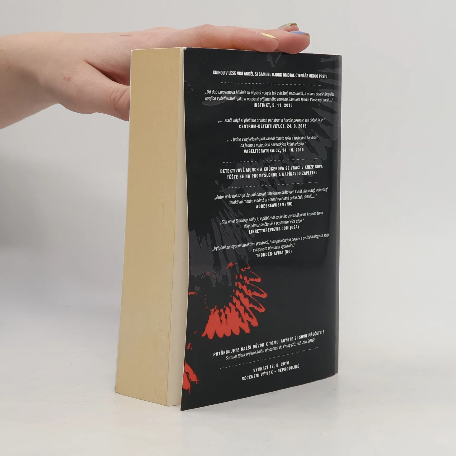 V lese kousek od Osla je v podivném hnízdě ze sovího peří nalezeno tělo sedmnáctileté dívky, jež se před tím ztratila z domova pro problémovou mládež. Případem se začne zabývat zkušený detektiv Holger Munch se svým týmem. Vyšetřování pro nedostatek stop začíná váznout na mrtvém bodě, ale pak IT odborníkovi z oddělení vražd záhadný hecker pošle nahrávku, jež odhalí znepokojivé podrobnosti o osudu zabité dívky; ve filmu se na okraji mihne silueta vraha převlečeného za sovu, nočního dravce symbolizujícího smrt... A patrání se roztočí na plné obrátky. Sova opět přináší promyšlenou, napínavou zápletku a proniká hluboko pod povrch lidské mysli stejně jako první Bjorkův román V lese visí anděl. Zároveň se v ní noříme hlouběji do soukromí detektivů Holgera Muncha a Mii Krügerové, které si díky veleúspěšnému prvnímu dílu řady již oblíbili čtenáři v řadě zemí. Spolu s tím, jak se snaží co nejrychleji rozlousknout zapeklitý případ a zastavit brutálního vraha, se oba vyšetřovatelé musí porovnat i s řadou výzev, které před ně staví jejich osobní životy.