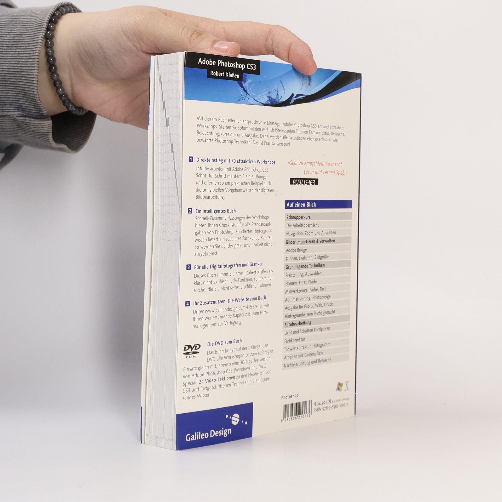 Dieses Buch vermittelt praktisches Know-how für Einsteiger im Grafik- und Fotobereich. Es behandelt sofort relevante Themen wie Bildkorrektur, Retusche, Beleuchtungs- und Farboptimierung, Automatisierung und Ausgabe. Neben neuen CS3-Funktionen werden bewährte Photoshop-Techniken behandelt. Die Struktur des Buches ermöglicht es Ihnen, die Workshops erfolgreich zu meistern und eigene Lösungen zu entwickeln. Schnell-Zusammenfassungen am Ende jedes Workshops fassen die Schritte übersichtlich zusammen und bieten praktische Checklisten für verschiedene Aufgaben. Ein separates Fachkunde-Kapitel liefert fundierte Hintergrundinformationen zu den theoretischen Grundlagen, sodass die praktische Arbeit nicht ins Stocken gerät. Bei Fragen finden Sie alle Erklärungen schnell. Themen im Inhalt umfassen Importieren und Verwalten, Drehen, Skalieren, Auswahlen, Füllungen, Zeichnen, Ebenen, Licht- und Schattenkorrekturen, Farbkorrekturen, Camera Raw, Nachbearbeitung, Retusche, Transformieren, Pfade, Text, Automatisierung und Ausgabe, sowie ein Glossar.