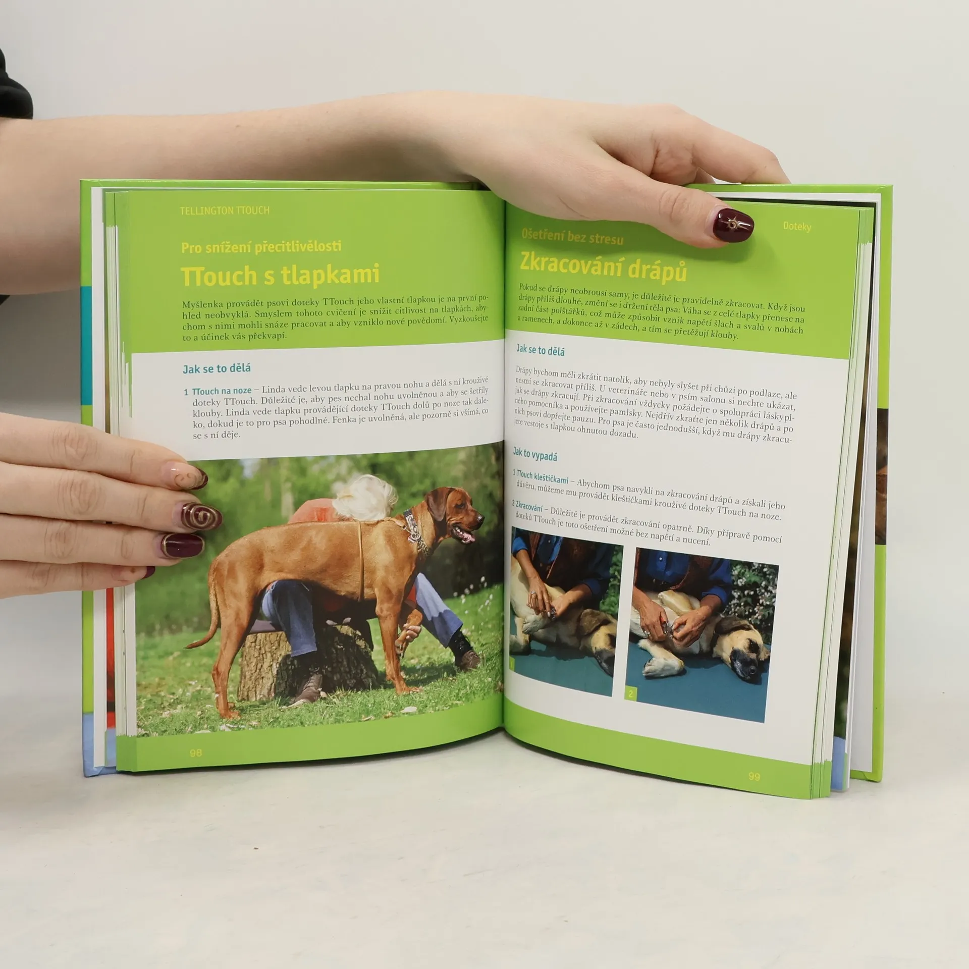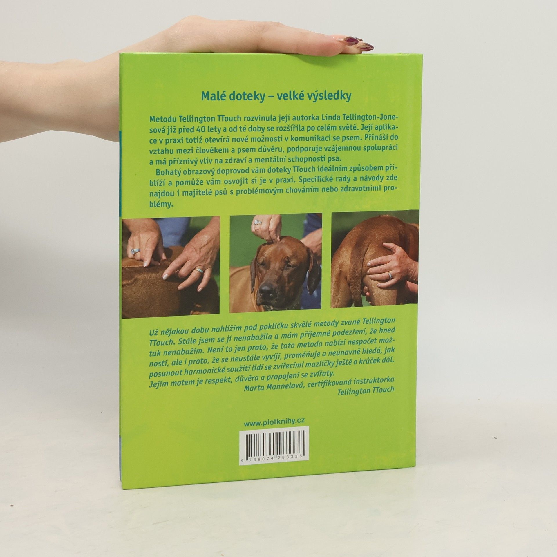 „Malé doteky – velké výsledky.“ Metodu Tellington TTouch rozvinula její autorka Linda Tellington-Jones již před 40 lety a od té doby se rozšířila po celém světě. Její aplikace v praxi totiž otevírá nové možnosti v komunikaci se psem. Tato metoda přináší do vztahu mezi člověkem a psem důvěru, podporuje vzájemnou spolupráci a má příznivý vliv na zdraví a mentální schopnosti psa. Bohatý obrazový doprovod vám doteky TTouch ideální způsobem přiblíží a pomůže vám osvojit si je v praxi. Rady a návody zde najdou i majitelé psů s problémovým chováním nebo zdravotními problémy.