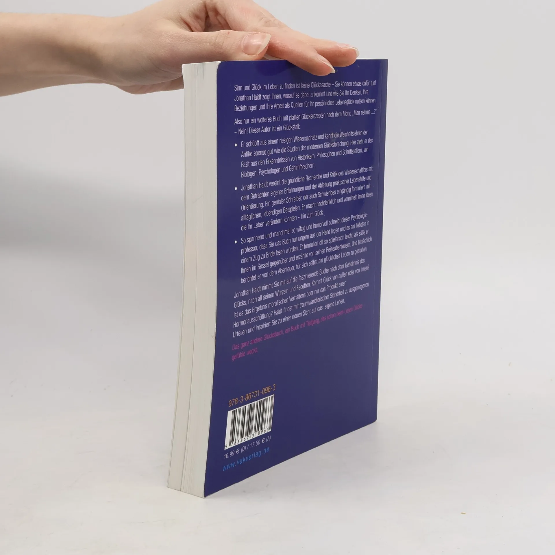 Sinn und Glück im Leben zu finden ist keine Glückssache – Sie können aktiv etwas dafür tun! Jonathan Haidt zeigt Ihnen, wie Sie Ihr Denken, Ihre Beziehungen und Ihre Arbeit als Quellen für persönliches Lebensglück nutzen können. Dies ist kein weiteres Buch mit platten Glücksrezepten. Der Autor schöpft aus einem umfangreichen Wissensschatz und kombiniert die Weisheitslehren der Antike mit modernen Studien zur Glücksforschung. Er zieht Erkenntnisse von Historikern, Philosophen, Biologen und Psychologen heran, um praktische Lebenshilfe und Orientierung abzuleiten. Haidt vereint gründliche Recherche mit persönlichen Erfahrungen und formuliert komplexe Themen verständlich, angereichert mit lebendigen Beispielen. Seine Schreibweise ist so fesselnd, dass Sie das Buch kaum aus der Hand legen können. Er berichtet von seinem Abenteuer, ein glückliches Leben zu gestalten, und lädt Sie ein, das Geheimnis des Glücks zu erkunden. Kommt Glück von außen oder innen? Ist es das Ergebnis moralischen Verhaltens oder hormoneller Einflüsse? Haidt findet ausgewogene Urteile und inspiriert zu einer neuen Sicht auf das eigene Leben. Ein tiefgründiges Buch, das beim Lesen Glücksgefühle weckt.