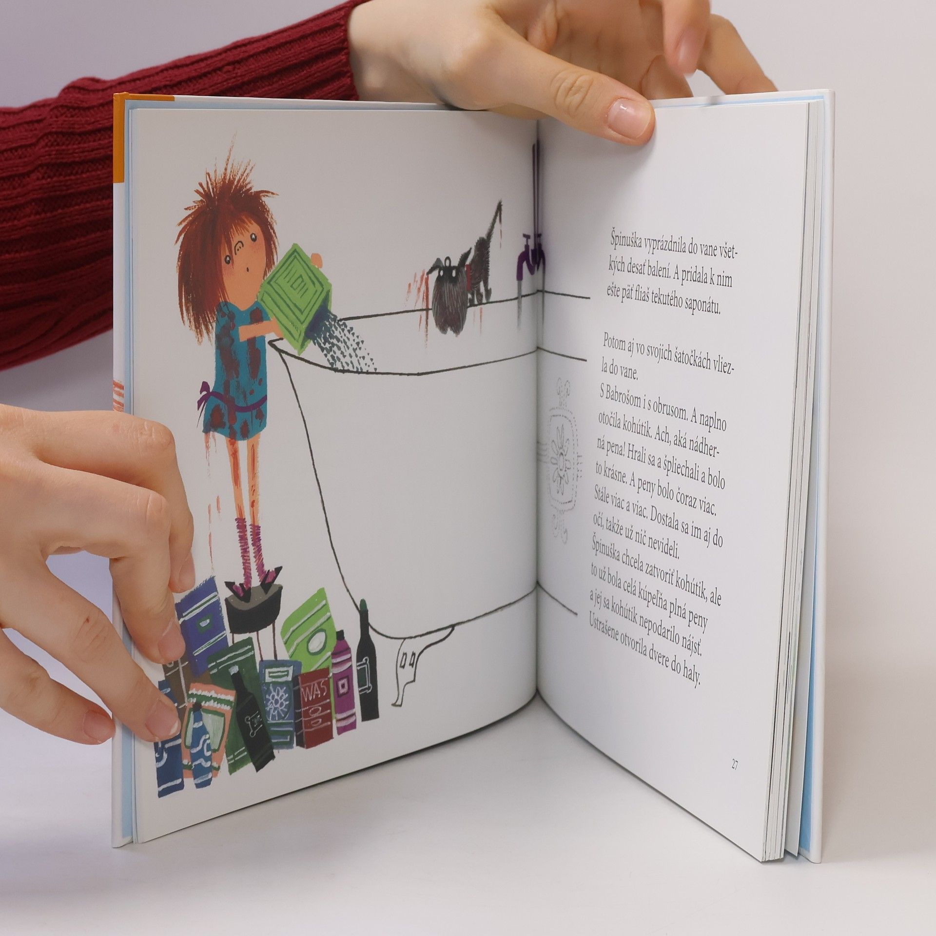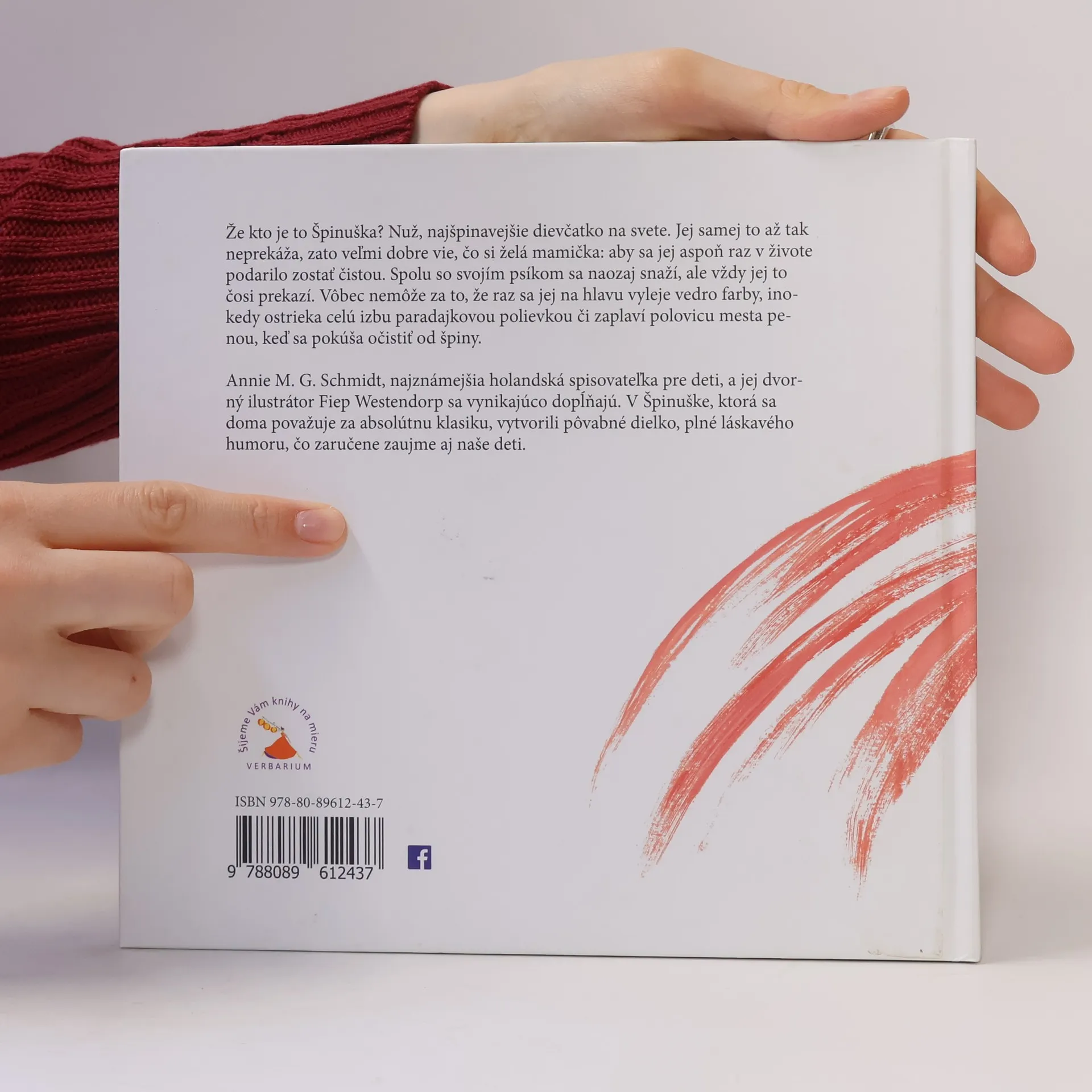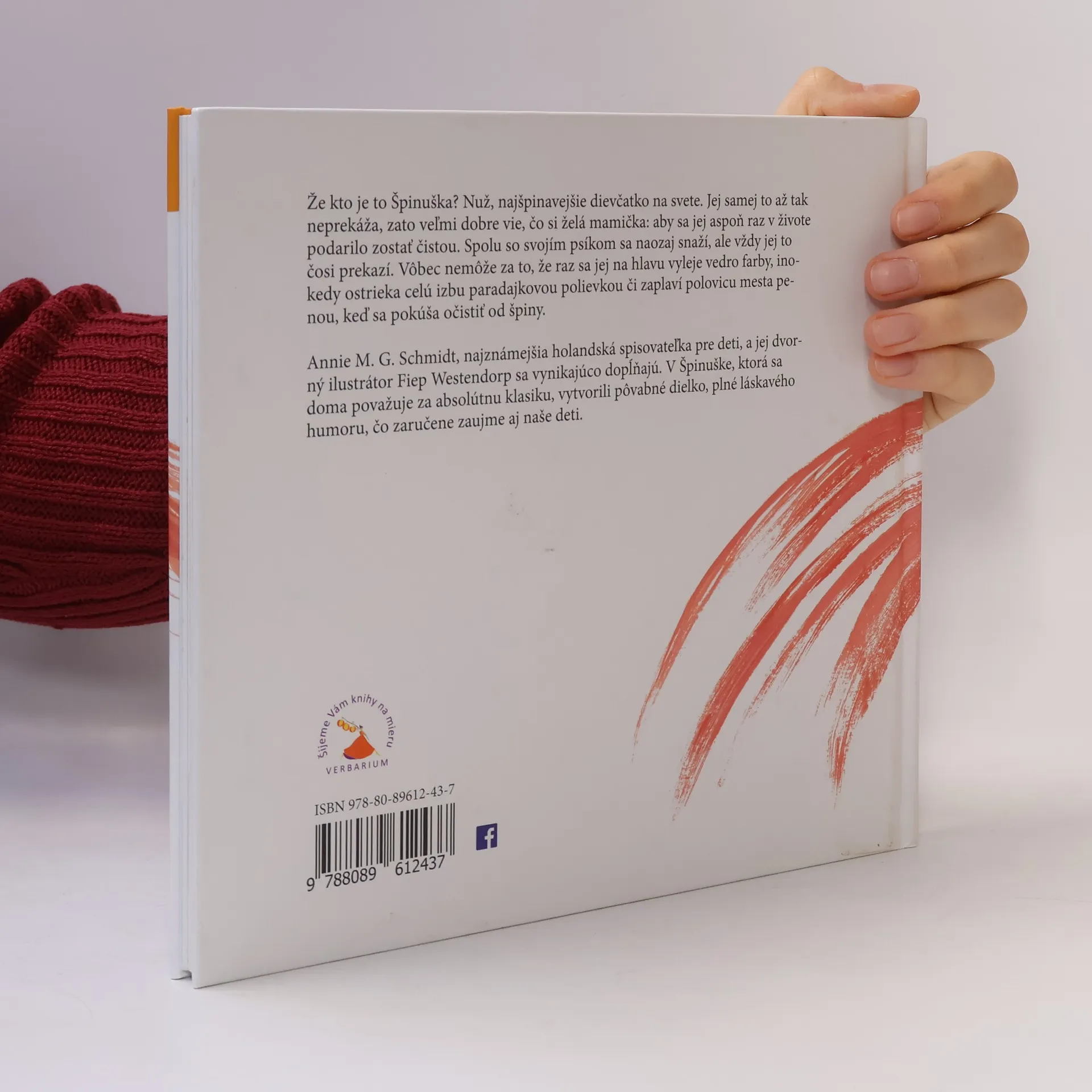 Špinuška v koupelně, Špinuška u kadeřníka, Špinuška v kuchyni, Špinuška při úklidu, Špinuška na návštěvě... ze všeho, co Špinuška a její pes podniknou, vznikne parádní binec. Nicméně i tak bude Špinuška na konci svých dobrodružství odměněna čestnou stuhou od starosty. Nejznámější nizozemská autorka knih pro děti A. M.G. Schmidtová přináší humorné příběhy holčičky, která nevydrží čistá déle než půl hodiny, doplněné úchvatnými ilustracemi F. Westendorpové.