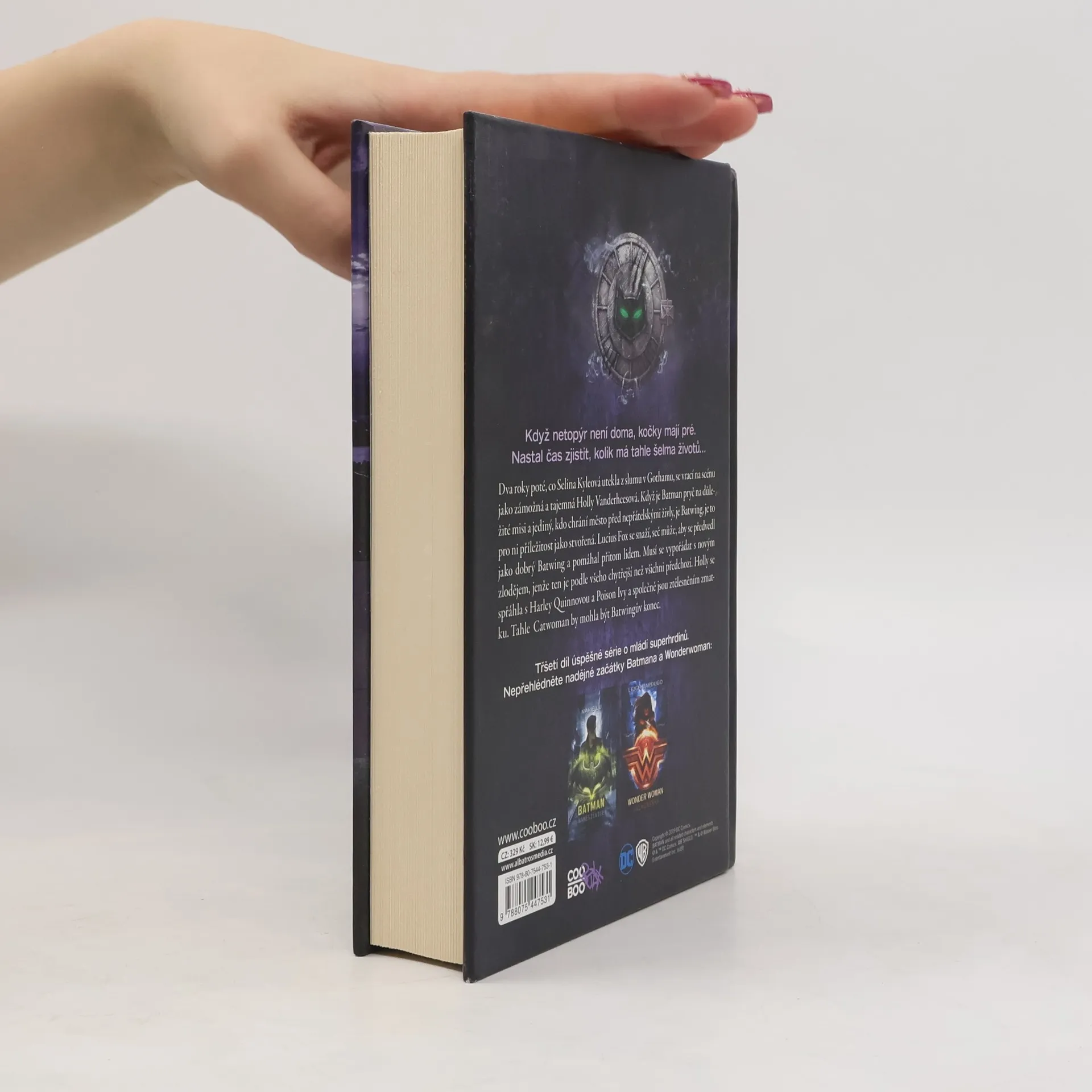 Po Wonder Woman a Batmanovi přichází třetí díl úspěšné série o mládí superhrdinů. Kočičí žena z pera bestsellerové Sarah J. Maasové. “ Je čas zjistit, kolik životů tahle kočka vlastně má. Selina Kyleová se po dvou letech vrací do Gothamu, ovšem tentokrát jako Catwoman. Hraje nebezpečnou hru na kočku a myš, domlouvá zvláštní spojenectví, v noci se zaplétá s Batwingem a ve dne s pekelně krásným sousedem Luciusem Foxem. Přestože si myslí, že své minulosti unikla, šeredně se mýlí. Zvládne obětovat to, co je jejímu srdci nejbližší?