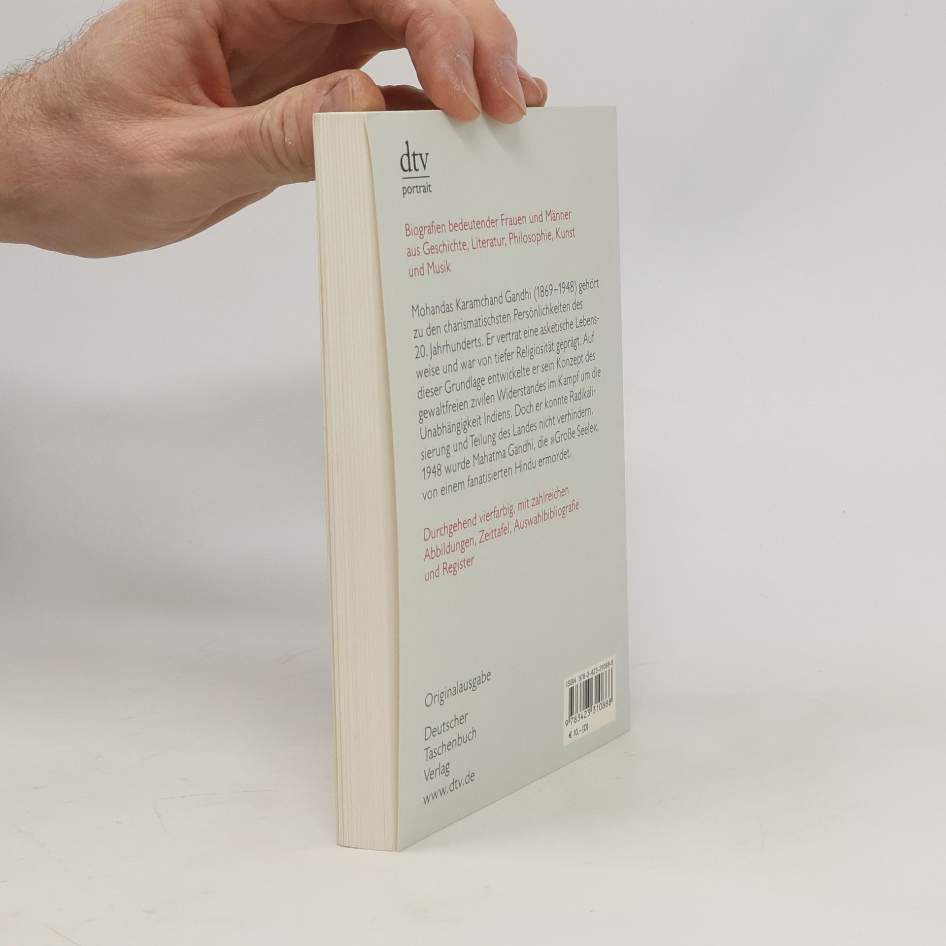Mahatma Gandhi (1869-1948) gehört zu den charismatischsten Persönlichkeiten des 20. Jahrhunderts. Er vertrat eine asketische Lebensweise und war von tiefer Religiosität geprägt. Auf dieser Grundlage entwickelte er sein Konzept des gewaltfreien zivilen Widerstandes. Er setzte sich für die Rechte der Inder in Südafrika ein, wurde 1914 Führer des indischen Nationalkongresses und kämpfte für die Unabhängigkeit des Landes. 1948 wurde die »Große Seele« von einem fanatisierten Hindu ermordet.