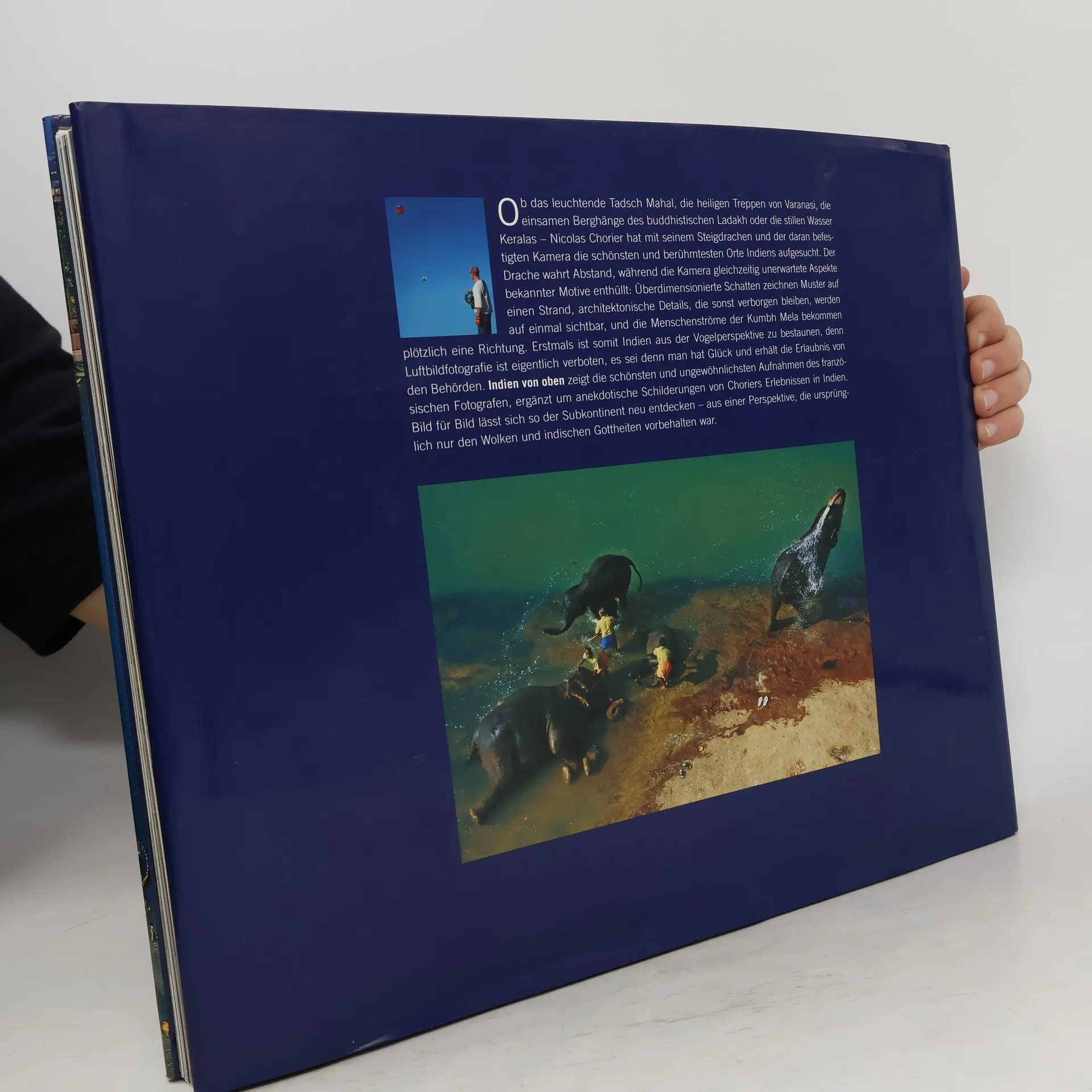 Ein paar Quadratzentimeter Stoff, ein bisschen technisches Knowhow, eine steife Brise - und schon schwebt die Kamera an der Drachenschnur in den Himmel. Der Fotograf verbündet sich mit dem Wind, zähmt dessen unerschöpfliche Energie. Die dabei entstehenden Bilder provozieren unseren Sinn für Orientierung, spielen mit Strukturen und Geweben und bieten Nahaufnahmen von Indien aus einem ungewöhnlichen Blickwinkel: Überdimensionierte Schatten zeichnen Muster auf einen Strand, architektonische Details, die sonst verborgen bleiben, werden auf einmal sichtbar, die Menschenströme der Kumbh Mela bekommen plötzlich eine Richtung. Nicolas Chorier hat seinen Drachen über der Millionenstadt Mumbai steigen lassen, er hat Fischern am einsamen Strand bei der Arbeit zugeschaut, und er blickt Dachdeckern beim Vollenden einer Kuppel über die Schulter. Der sorgfältig nach den jeweiligen Windverhältnissen ausgewählte kite erlaubt - einmal am Himmel installiert - dem Fotografen auf den richtigen Augenblick zu warten. Die Kamera fliegt, ein stiller Zuschauer, und ermöglicht einen intimen und gleichzeitig fremden Blick auf die Vielfalt indischen Lebens. Bild für Bild lässt sich so der Subkontinent neu entdecken - aus einer Perspektive, die ursprünglich nur den Wolken und indischen Gottheiten vorbehalten war. Die expressiven Aufnahmen werden ergänzt durch anekdotische Schilderungen von Choriers Odyssee durch Indien.