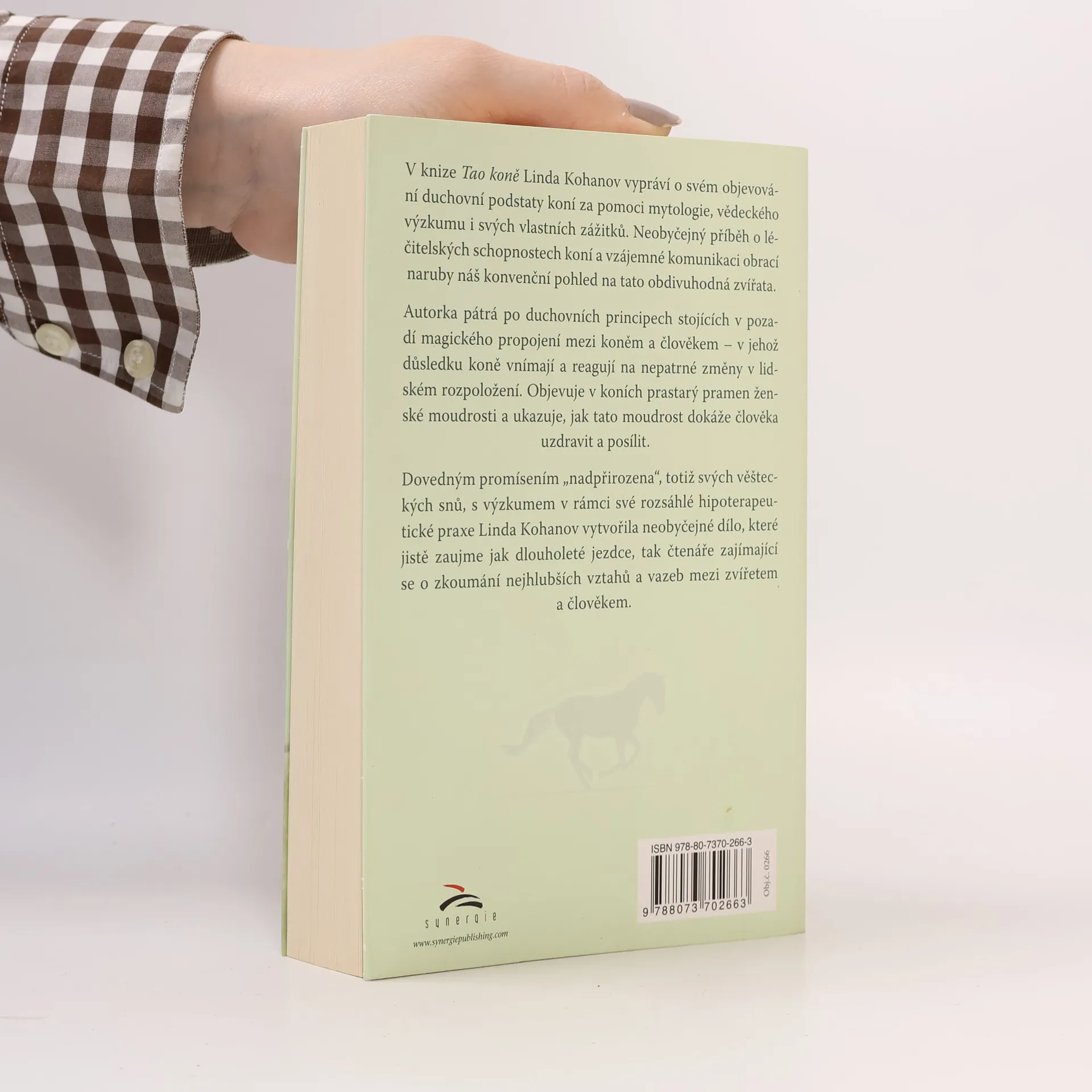 V knize Tao koně Linda Kohanov vypráví o svém objevování duchovní podstaty koní za pomoci mytologie, vědeckého výzkumu i svých vlastních zážitků. Neobyčejný příběh o léčitelských schopnostech koní a vzájemné komunikaci obrací naruby náš konvenční pohled na tato obdivuhodná zvířata. Autorka také pátrá po duchovních principech stojících v pozadí magického propojení mezi koněm a člověkem – v jehož důsledku koně vnímají a reagují na nepatrné změny v lidském rozpoložení. Objevuje v koních prastarý pramen ženské moudrosti a ukazuje, jak tato moudrost dokáže člověka uzdravit a posílit. Časem objevila i neobyčejnou schopnost koní probouzet i v lidech intuici zrcadlením autentických pocitů, které chtějí skrýt – což z nich činí velice účinné terapeutické pomocníky a učitele. Linda popisuje jemné emocionální, až jasnozřivé prožitky, které zažívala po čase stráveném interakcí se stádem. Podrobně se věnuje technikám, které na základě svých zážitků vypracovala, aby s pomocí koní i svým studentům pomohla posílit a propojit vnímání sama sebe v tělesné a duševní jednotě a uvědomit si své mimosmyslové schopnosti. Dovedným promísením „nadpřirozena“, totiž svých věšteckých snů spolu s výzkumem v rámci své rozsáhlé hipoterapeutické praxe Linda Kohanov vytvořila neobyčejné dílo, které jistě zaujme jak dlouholeté jezdce, tak čtenáře, zajímající se o zkoumání nejhlubších vztahů a vazeb mezi zvířetem a člověkem.