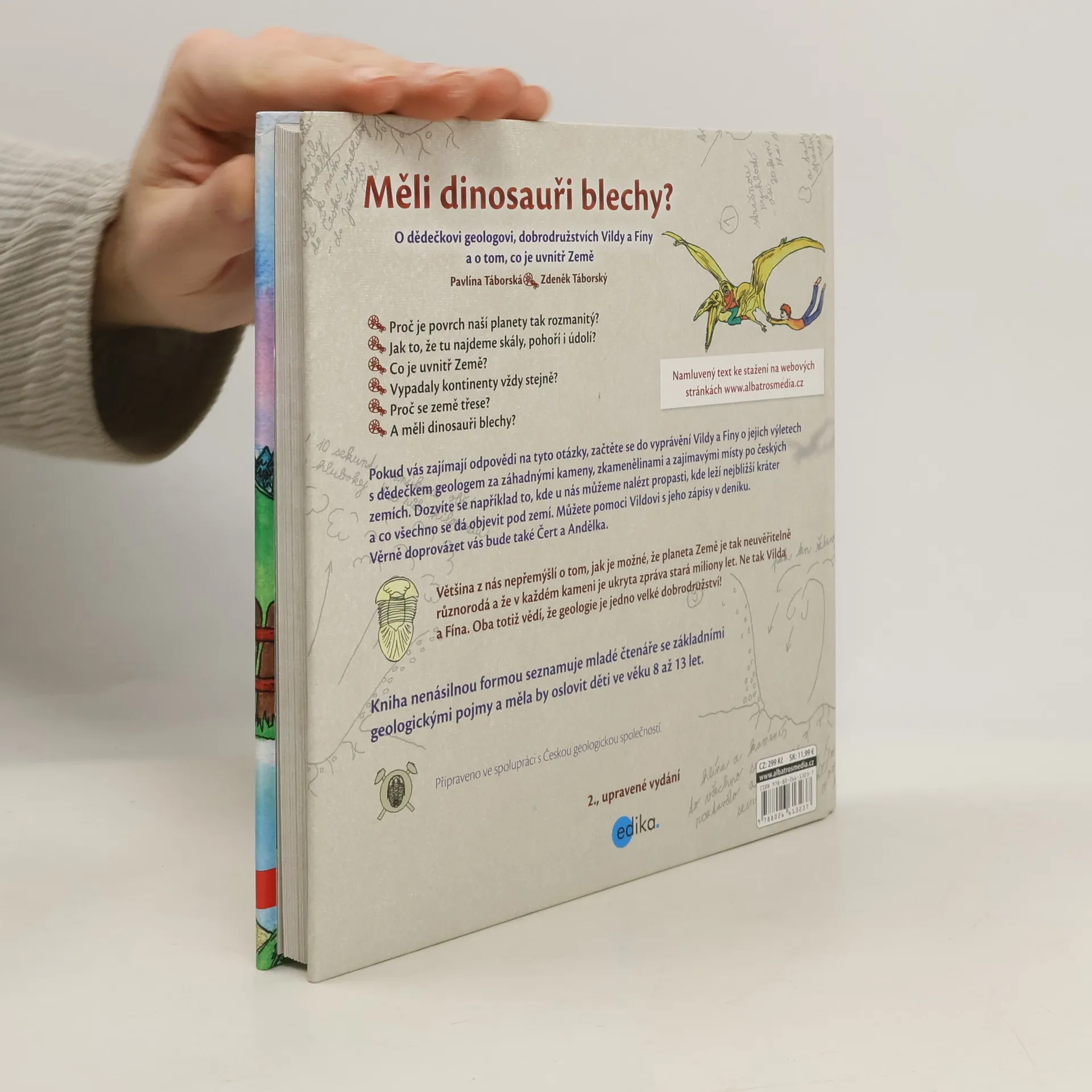 Proč je povrch naší planety tak rozmanitý? * Jak to, že tu najdeme skály, pohoří i údolí? * Co je uvnitř Země? * Vypadaly kontinenty vždy stejně? * Proč se země třese? * A měli dinosauři blechy? Pokud vás zajímají odpovědi na tyto otázky, začtěte se do vyprávění Vildy a Fíny o jejich výletech s dědečkem geologem za záhadnými kameny, zkamenělinami a zajímavými místy po českých zemích. Dozvíte se například to, kde u nás můžeme nalézt propasti, kde leží nejbližší kráter a co všechno se dá objevit pod zemí. Můžete pomoci Vildovi s jeho zápisy v deníku. Věrně doprovázet vás bude také Čert a Andělka. Většina z nás nepřemýšlí o tom, jak je možné, že planeta Země je tak neuvěřitelně různorodá a že v každém kameni je ukryta zpráva stará miliony let. Ne tak Vilda a Fína. Oba totiž vědí, že geologie je jedno velké dobrodružství! Kniha nenásilnou formou seznamuje mladé čtenáře se základními geologickými pojmy a měla by oslovit děti ve věku 8 až 13 let.