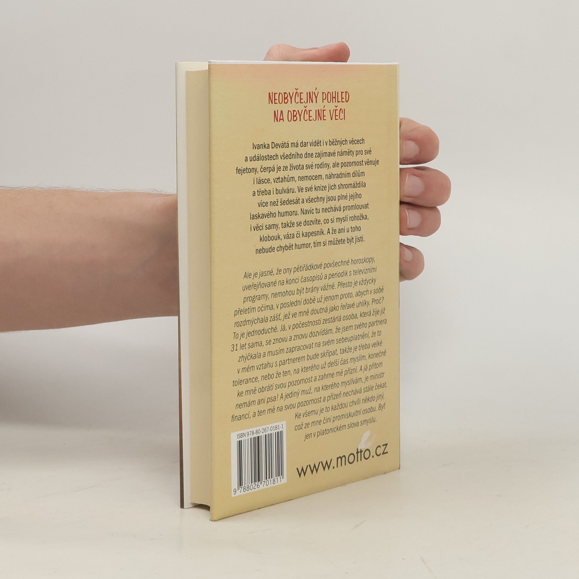 Kniha fejetonů o lásce, vztazích, nemocech, běžném životě a třeba i bulváru. Ve své knize jich Ivanka Devátá shromáždila více než šedesát. Navíc tu nechává promlouvat i věci samy, takže se dozvíte, co si myslí rohožka, klobouk, váza či kapesník. A že u toho nebude chybět humor, tím si můžete být jisti!