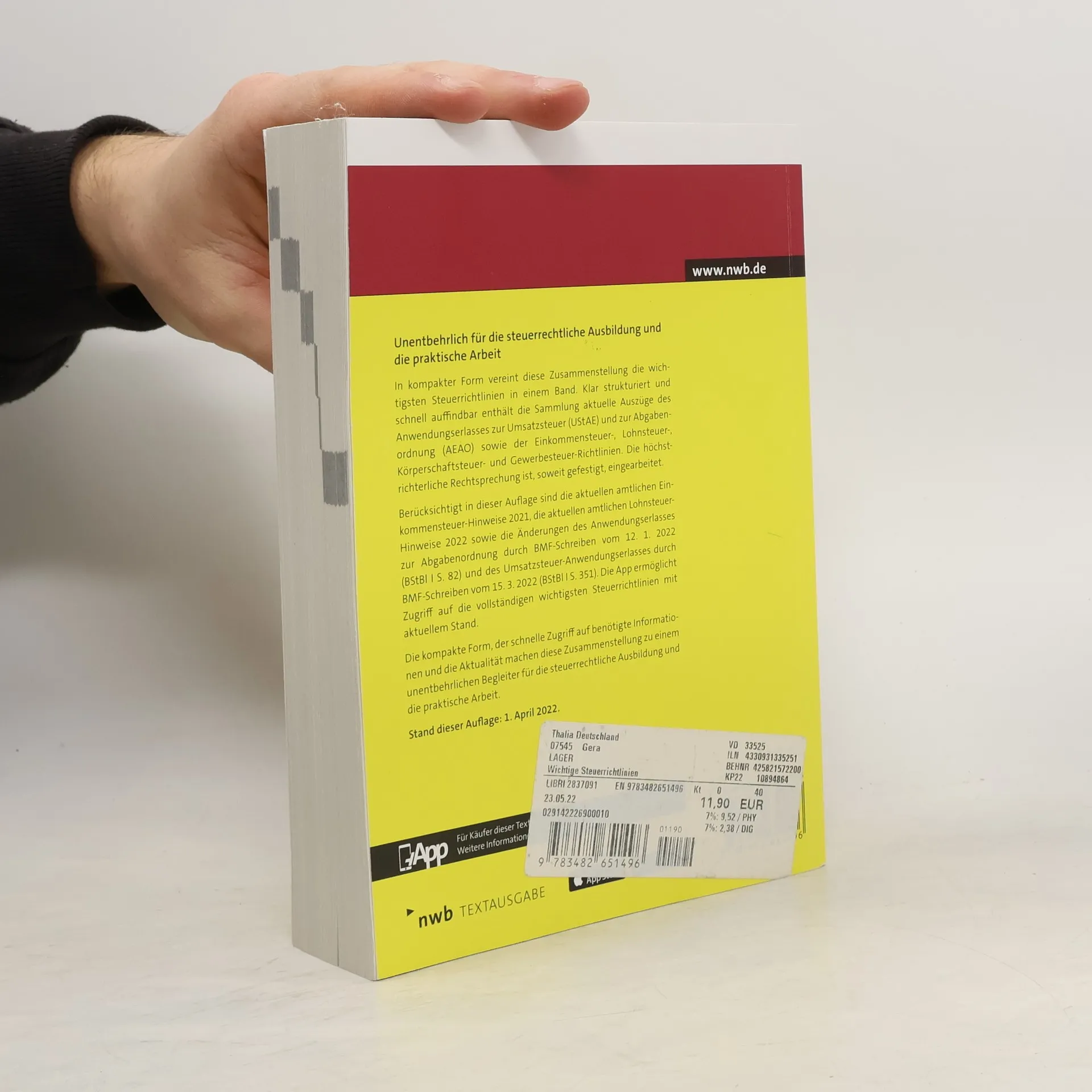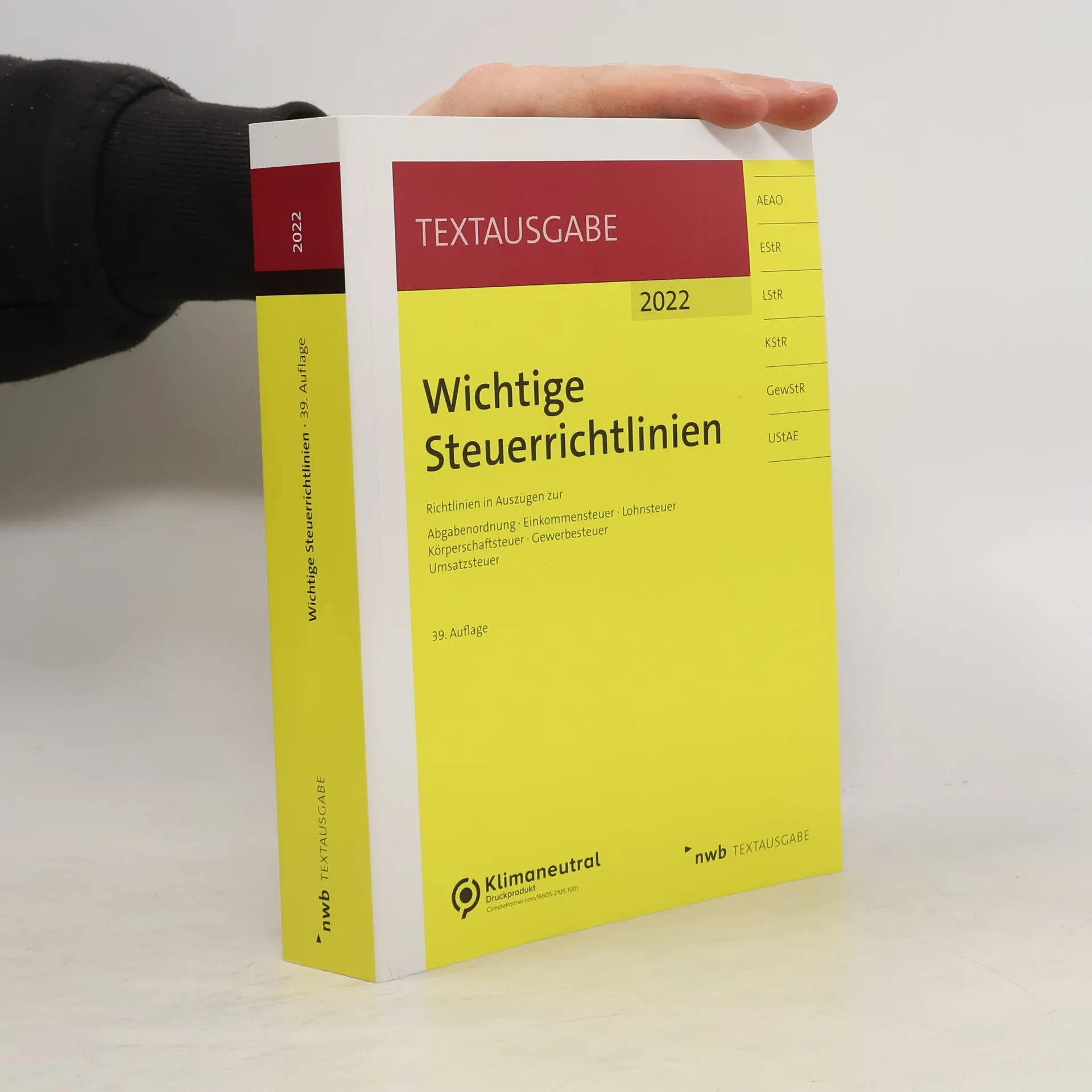 Die unentbehrliche Arbeitshilfe für Ausbildung und Praxis bietet eine kompakte Zusammenstellung der wichtigsten Steuerrichtlinien. Diese NWB-Textausgabe enthält aktuelle Auszüge der Anwendungserlasse zur Umsatzsteuer (UStAE) und Abgabenordnung (AEAO) sowie der Richtlinien zur Einkommensteuer, Lohnsteuer, Körperschaftsteuer und Gewerbesteuer. Die Sammlung ist klar strukturiert und ermöglicht einen schnellen Zugriff auf relevante Informationen. Die höchstrichterliche Rechtsprechung ist, soweit gefestigt, integriert. Die Anwendungserlasse und Richtlinien, herausgegeben vom Bundesministerium der Finanzen, sind für die Finanzverwaltung bindend und klären Zweifels- sowie Anwendungsfragen, um eine einheitliche Anwendung des Steuerrechts zu gewährleisten. Berücksichtigt sind auch die aktuellen amtlichen Hinweise zur Einkommensteuer 2018 und zur Lohnsteuer 2019 sowie die Änderungen der Anwendungserlasse. Kostenlose Aktualisierungen im Internet garantieren stets aktuelle Informationen. Diese Zusammenstellung ist somit ein unverzichtbarer Begleiter für die steuerrechtliche Ausbildung und die praktische Arbeit. Stand dieser Auflage: 1. April 2019.
