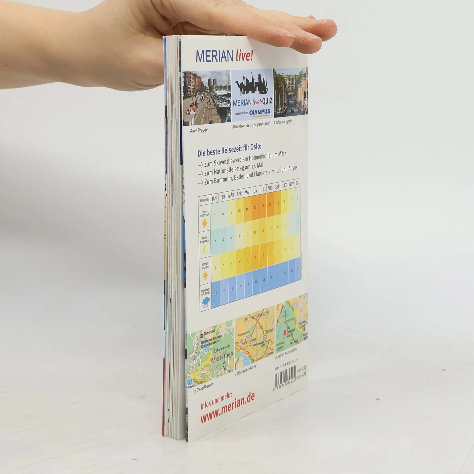 Mit MERIAN live! Oslo erleben Offen, modern und grün - so lässt sich die junge Hauptstadt Norwegens am besten beschreiben. Die einzigartige Lage am Ende des Oslofjords mit seinen grünen Inseln verzaubert den Besucher. Die Stadt selber ist angenehm überschaubar und lässt sich bequem zu Fuß erkunden. Sehenswürdigkeiten wie Schloss, Rathaus und die neue Oper liegen dicht beieinander. Unbedingt einen Besuch wert sind kulturelle Highlights wie der Neubau des Astrup Feranley Museums oder die Museumsinsel Bygdøy. Kompakt und übersichtlich bietet MERIAN live! alles Wissenswerte für einen gelungenen Aufenthalt in- MERIAN TopTen : Die 10 wichtigsten Sehenswürdigkeiten auf einen Blick- MERIAN TopTen 360° : Umgebungskarten mit ausgewählten MERIAN-TopTen und umliegenden Kultur-, Restaurant- und Shoppingadressen- Mit 10 MERIAN Tipps die weniger bekannten Seiten der Stadt entdecken- FotoTipps für lohnenswerte Motive- Fundierte Beschreibungen aller wichtigen Orte , Sehenswürdigkeiten und Museen von A bis Z- Empfehlungen für Übernachten , Essen und Trinken , Einkaufen , Ausgehen sowie Tipps für den umweltbewussten Urlaub- Zahlreiche Ideen für abwechslungsreiches Reisen mit Kindern