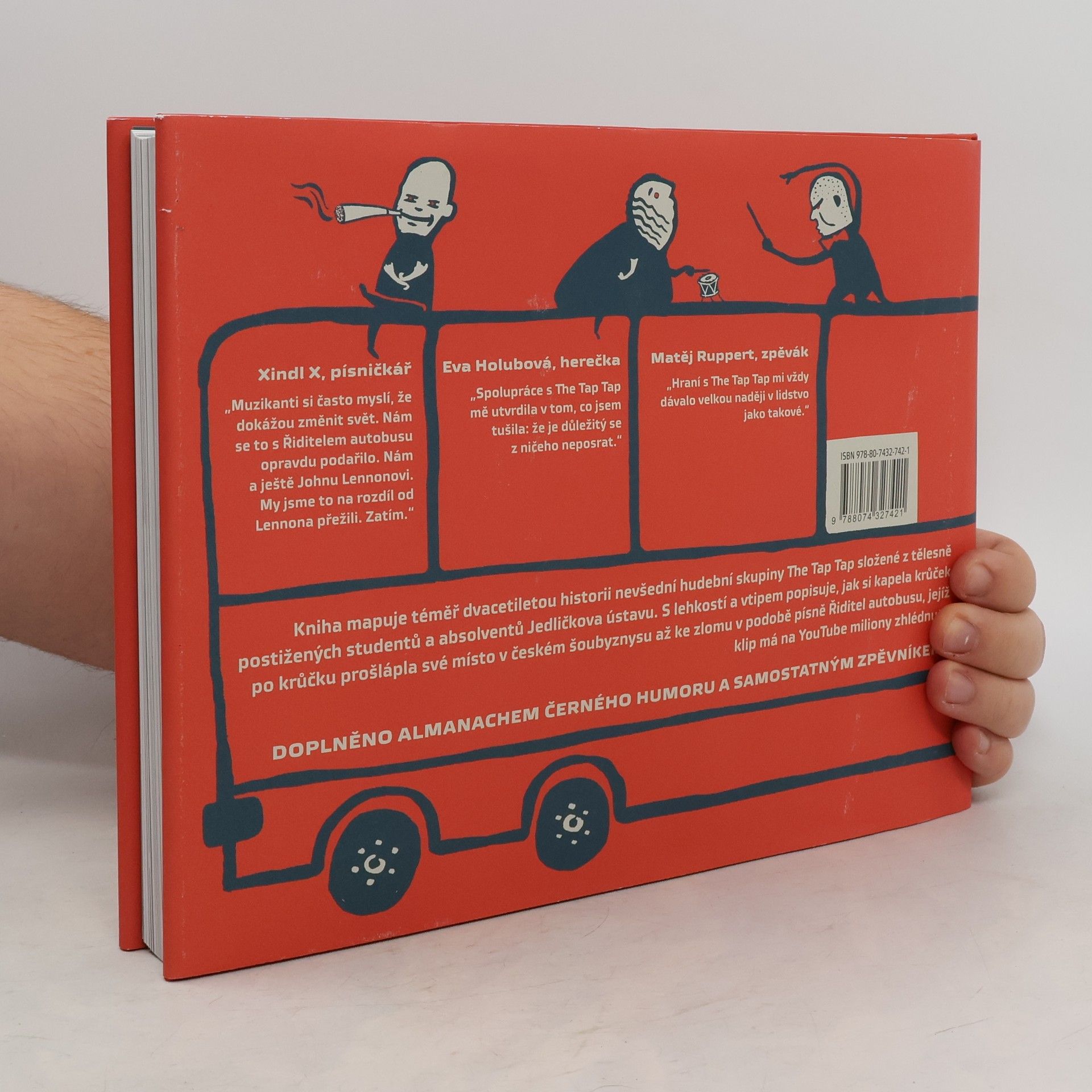 Kniha mapuje téměř dvacetiletou historii nevšední hudební skupiny The Tap Tap složené z tělesně postižených studentů a absolventů Jedličkova ústavu. S lehkostí a vtipem popisuje, jak si kapela krůček po krůčku prošlápla své místo v českém šoubyznysu až ke zlomu v podobě písně Řiditel autobusu, jejíž klip má na YouTube miliony zhlédnutí. Zábavně a výtvarně neotřele pojatá publikace dokumentuje významné akce v historii kapely a představuje jednotlivé členy, kteří vyznávají hesla jako „Sedíme si za svým“, „Jsme postižení muzikou“ nebo „Fňukat nikdy nebudem“. Čtenáři se dozvědí, jak to vypadá, když se třináct tělesně postižených, jeden autista a jeden nevidomý vydají k Mrtvému moři, co hudebníci zažili při koncertě na české ambasádě v Moskvě a proč kvůli nim zasedalo vedení pražského Dopravního podniku. Koupí této knihy finančně podpoříte Jedličkův ústav a kapelu The Tap Tap. Součástí knihy je zpěvník nejlepších písní souboru a Almanach černého humoru, sbírka nejotrlejších českých kreslených vtipů o vozíčkářích.
