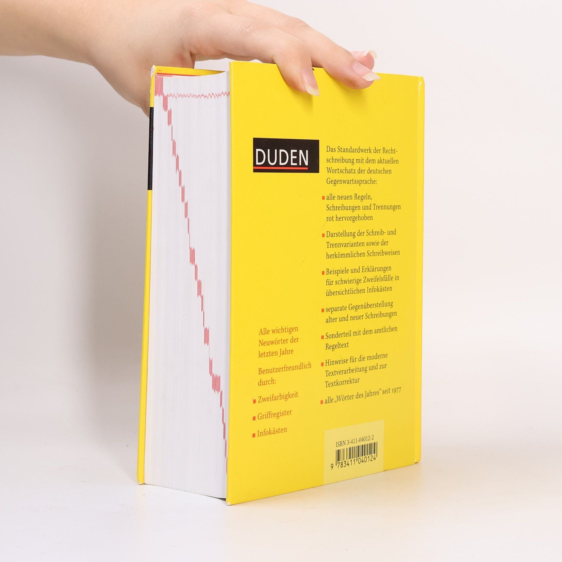Ganz im sommerlich gelben Outfit präsentiert sich der aktuelle Duden zur neuen Rechtschreibung. In dieser 22., völlig neu bearbeiteten Auflage sind alle neuen Rechtschreibregeln verbindlich zusammengefasst. Zudem haben es 5.000 neue Wörter geschafft, Einzug in das Standardwerk zu halten -- von "aufbrezeln" über "Bimbes" und "Maschendrahtzaun" bis hin zum "Warmduscher". Der Duden 2000 verzeichnet alle neuen und alle herkömmlichen Schreib- und Trennweisen eines Wortes und informiert somit umfassend über den heutigen Stand der deutschen Rechtschreibung. Um das Nachschlagen und damit den Umstieg auf die neuen Regeln zu erleichtern, wurde das gesamte Lay-out des Innenteils verbessert. Allen voran bieten die 300 farbig hervorgehobenen Infokästen zu Stichwörtern, deren Schreibung und korrekter Gebrauch besondere Schwierigkeiten bereiten, eine gute Übersicht. Informativ und gut verständlich ist auch der einleitende Teil "Rechtschreibung und Zeichensetzung". Die Regeln sind nach Themen wie Apostroph oder Bindestrich geordnet und farbig unterlegt. Ausführliche Beispiele zu den einzelnen Regeln helfen dabei, Unsicherheiten zu beseitigen. Somit ist der Duden 2000 mit seinen insgesamt 120.000 Stichwörtern und den über 500.000 Beispielen ein sehr vielseitiges deutsches Wörterbuch, das alle Fragen der sprachlichen Alltagspraxis beantwortet. Und der gelbe Klassiker ist auch mit CD-ROM erhältlich. --Bettina Wenzel und Herwig Slezak